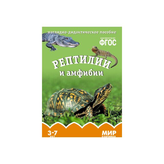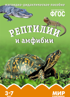 Наглядно-дидактическое пособие «Рептилии и амфибии» серии «Мир в картинках», предназначенное для групповых и индивидуальных занятий с детьми 3–7 лет в детском саду и дома, познакомит детей с черепахой, хамелеоном, крокодилом и другими рептилиями и амфибиями.