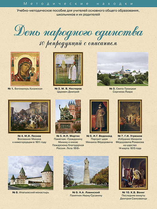 Список репродукций: 1. Богоматерь Казанская. 2. Нестеров М.В. Царевич Дмитрий. 3. Свято-Троицкая Сергиева Лавра. 4. Песков М.И. Воззвание Минина к нижегородцам в 1611 году. 5. Мартос И.П. Памятник "Гражданину Минину и князю Пожарскому благодарная Россия. Лета 1818". 6. Ведекинд И.Г. Портрет царя Михаила Федоровича. 7. Угрюмов Г.И. Избрание Михаила Федоровича Романова на царство 14 марта 1613 года. 8. Ипатьевский монастырь. 9. Лавинский Н.А. Памятник Ивану Сусанину. 10. Вениг К.Б. Последние минуты Дмитрия Самозванца.