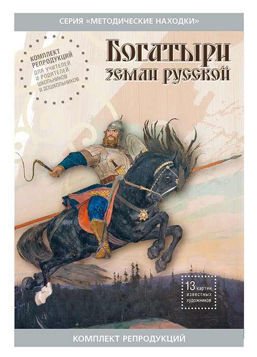 Комплект включает 13 художественных репродукций русских художников, изобразивших на своих полотнах былинных героев, богатырей, сказителей, которые своими деяниями прославляли Землю Русскую. Комплект репродукций в папке. На обороте каждой репродукции помещены методические рекомендации.
