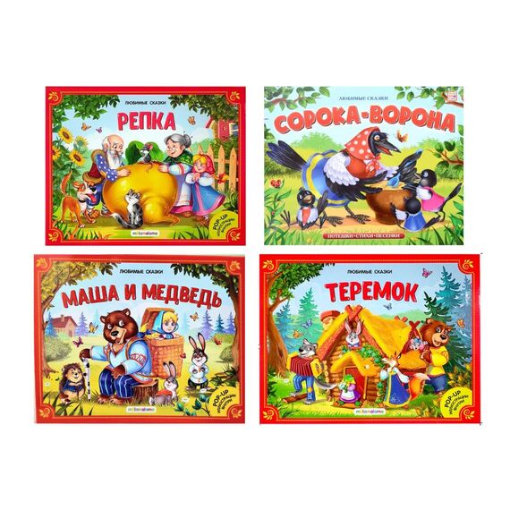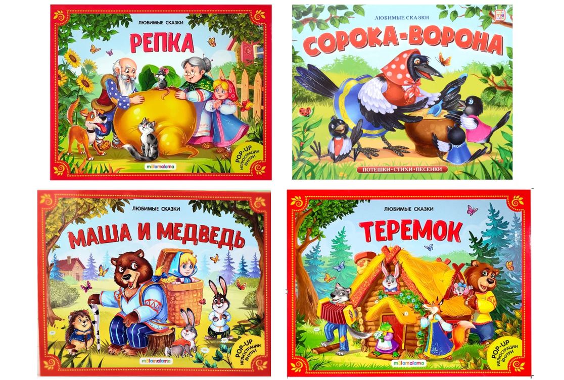 Книги в ассортитменте: "Маша и Медведь", "Репка", "Теремок", "Сорока-ворона".