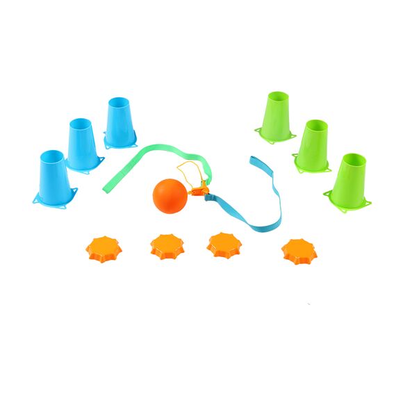 Спортивный инвентарь «Эстафета» способствует физическому развитию детей. Развивает общую моторику и координацию движений, глазомер и меткость, умение ориентироваться в пространстве. Как играть: игроки одновременно растягивают резинку и раскачивая мяч, сбивают мишени-стаканы. Предназначен для групповых занятий.