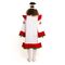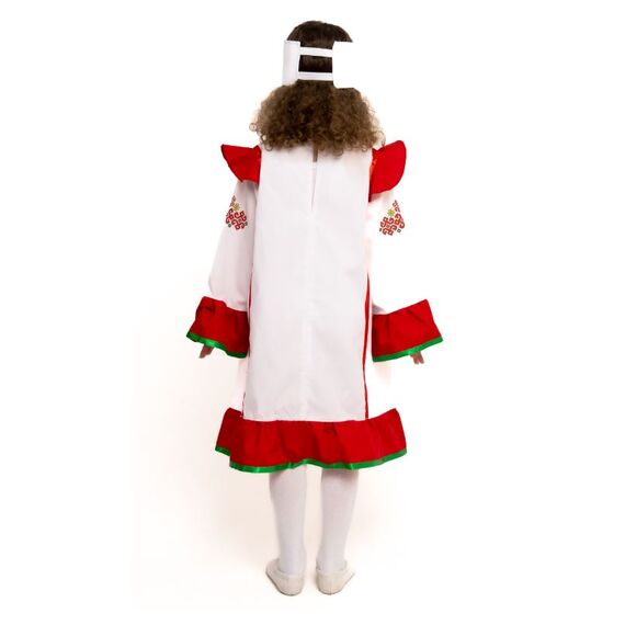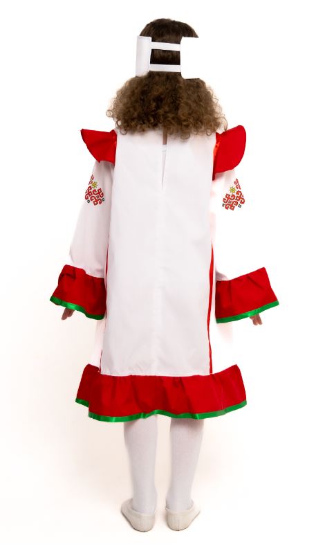 1. Платье белое платье с красной отделкой по рукавам, по низу и на груди и по плечам, украшенное лентами и наклейками в стиле народного узора. Застежка сзади на пуговицу.