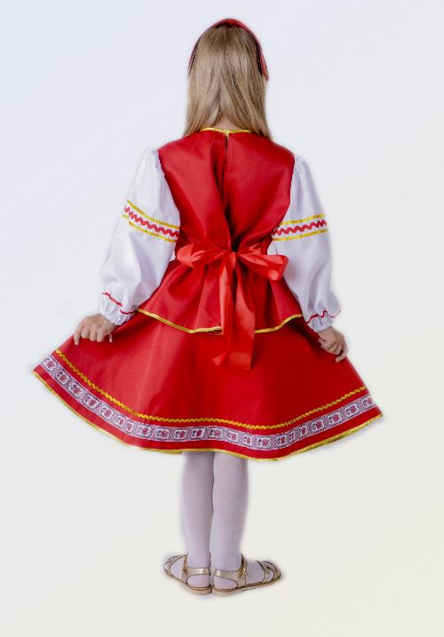 Комплектация: юбка с резинкой на поясе, жакет — имитация жилета и блузки, сзади регулируется по талии атласными лентами, застежка сзади на пуговку, головной убор сзади на резинке.