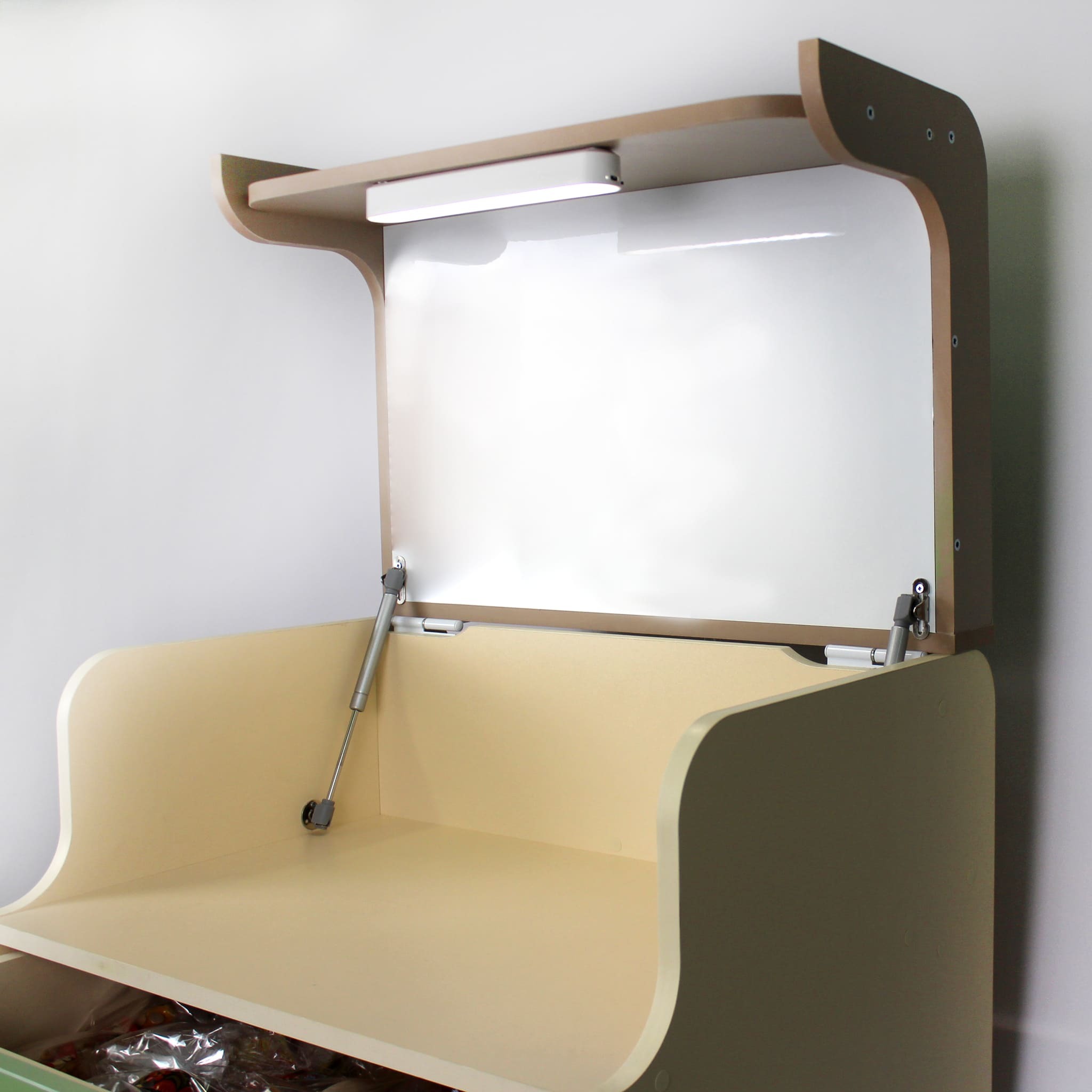 Материалы: ЛДСП 16 мм; кромка ПВХ 0,4-2 мм; подъемник газовый; карточные петли; поворотные колёса cо стопорами, прозрачные; направляющие шариковые полного выдвижения. магнитно-маркерное полотно.