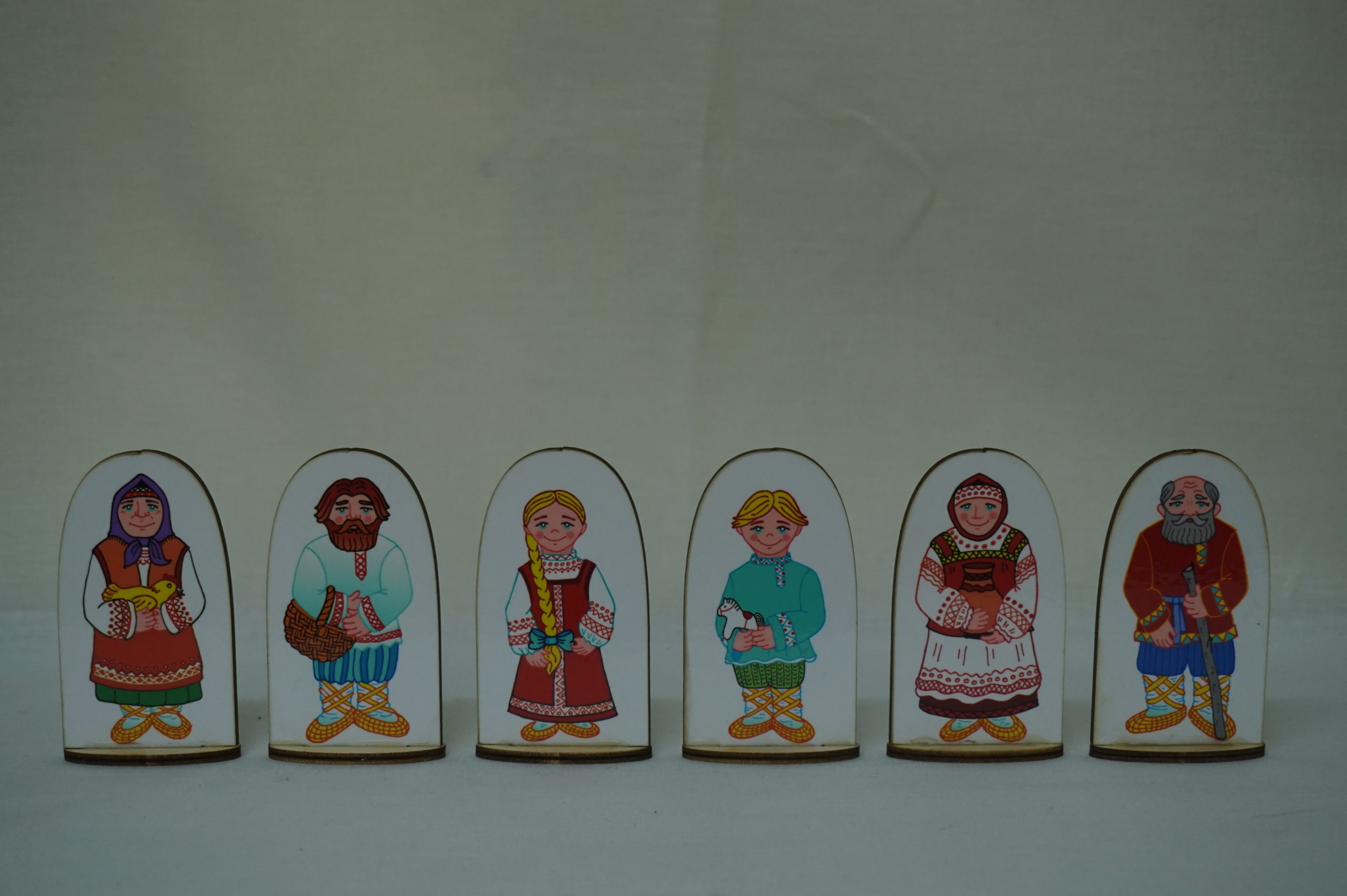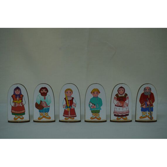 Набор кукол на подставке выполнен из фанеры с изображенными членами русской семьи в национальных костюмах: дедушка, бабушка, папа, мама, мальчик, девочка. Данные игрушки помогут узнать историю, особенности, культуру и быт народа России. Могут использоваться на тематических занятиях в детских садах и начальной школе.