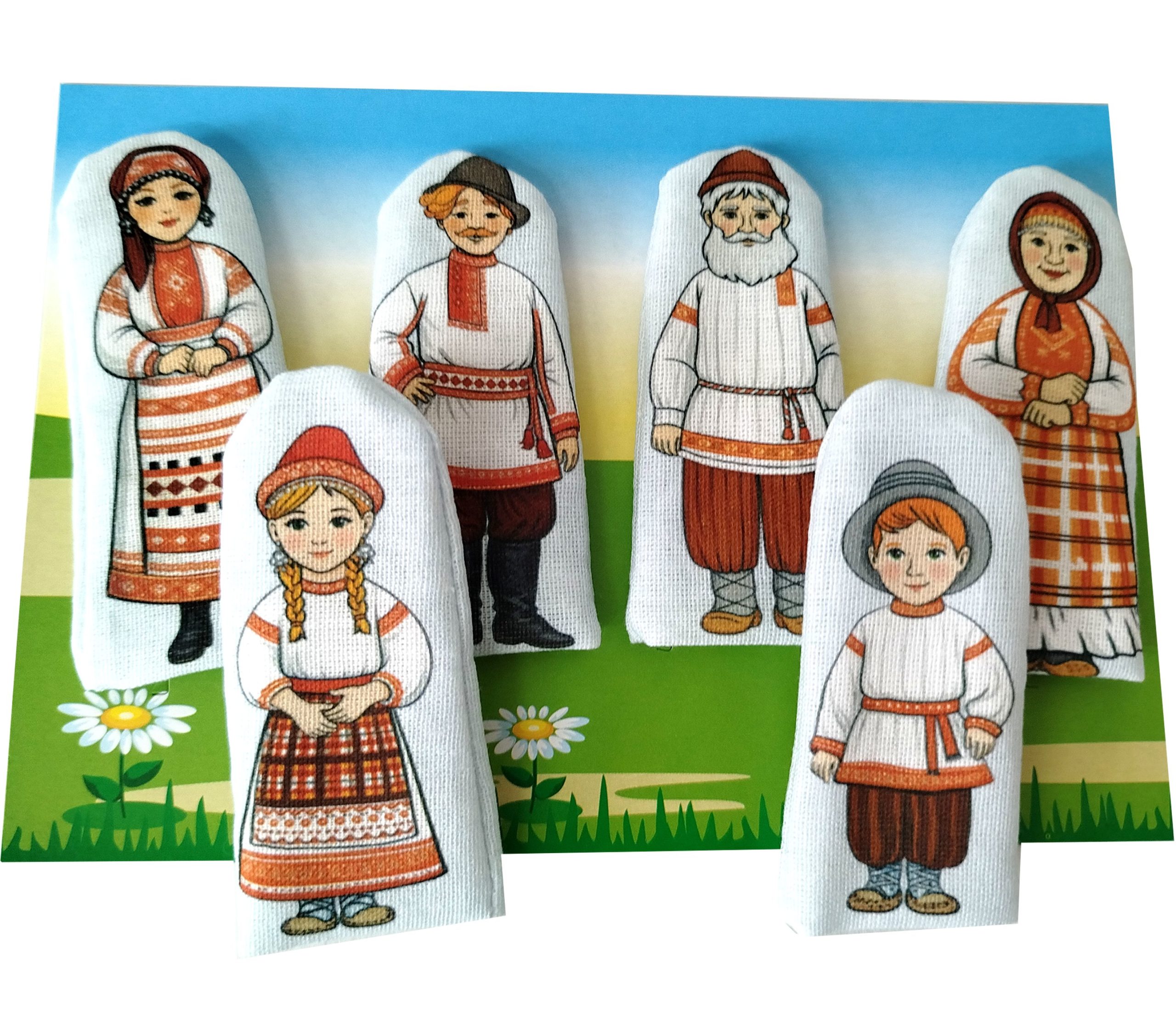 Набор пальчиковых кукол с изображенными членами удмуртской семьи в национальных костюмах: дедушка, бабушка, папа, мама, мальчик, девочка. Данные игрушки помогут узнать историю, особенности, культуру и быт народа Удмуртии. Могут использоваться на тематических занятиях в детских садах и начальной школе.