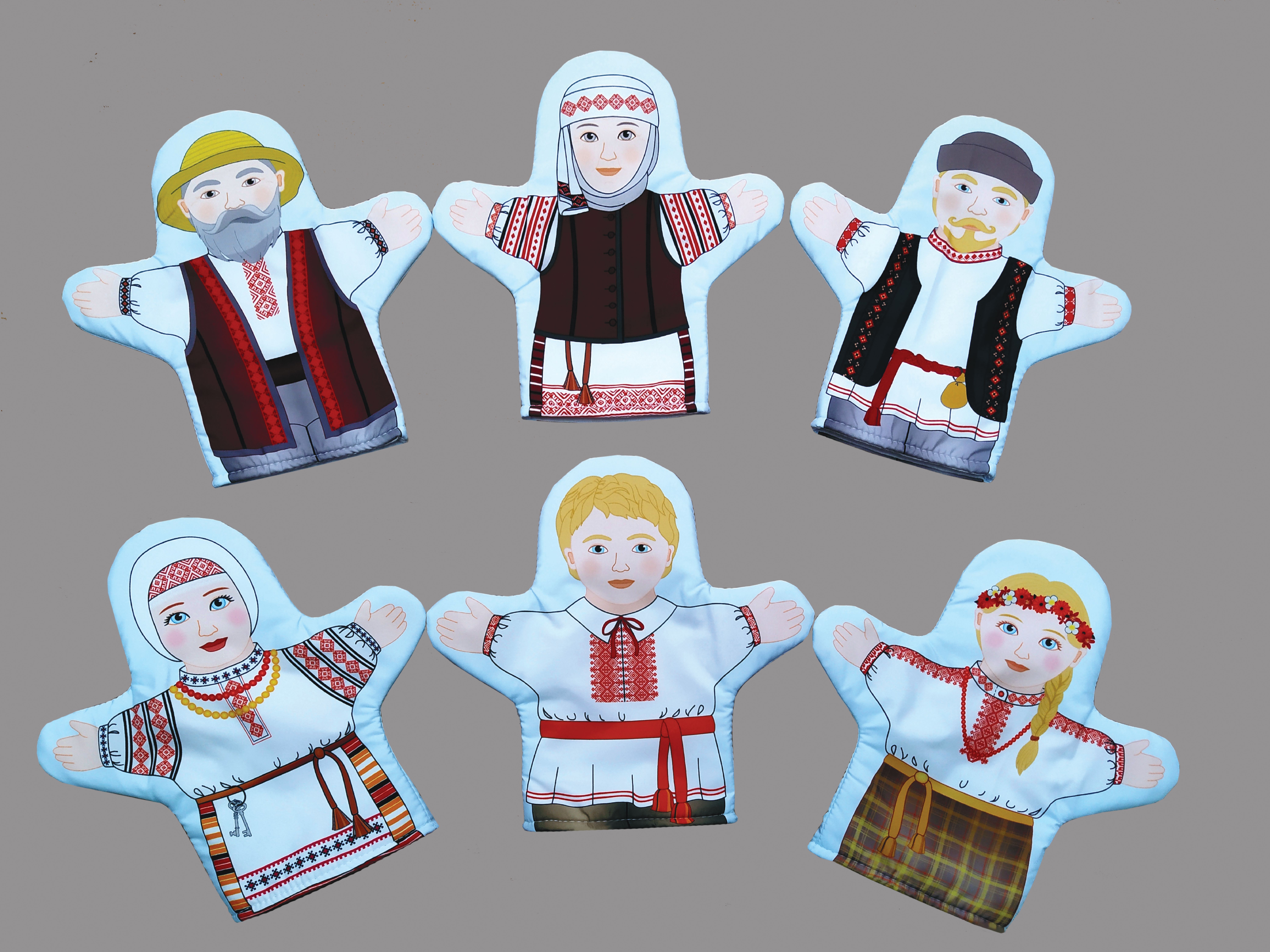 Набор наручных кукол представляет собой рукавички с изображенными членами белорусской семьи в национальных костюмах: дедушка, бабушка, папа, мама, мальчик, девочка. Данные игрушки помогут узнать историю, особенности, культуру и быт белорусского народа. Могут использоваться на тематических занятиях в детских садах и начальной школе.