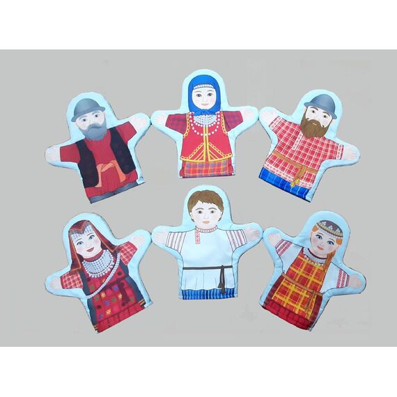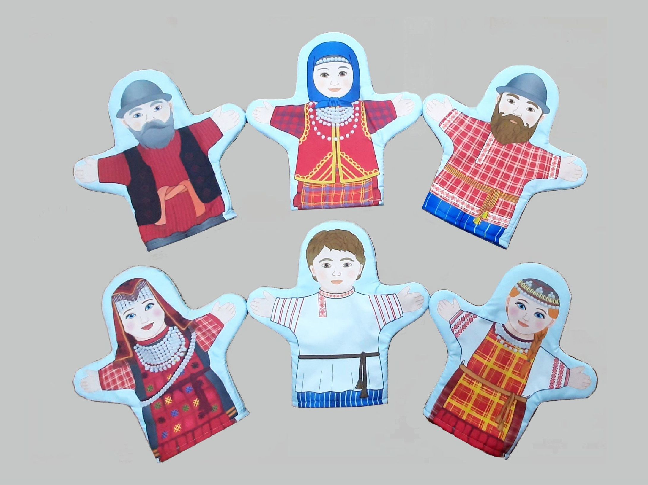 Набор наручных кукол представляет собой рукавички с изображенными членами удмуртской семьи в национальных костюмах: дедушка, бабушка, папа, мама, мальчик, девочка. Данные игрушки помогут узнать историю, особенности, культуру и быт народа Удмуртии. Могут использоваться на тематических занятиях в детских садах и начальной школе.