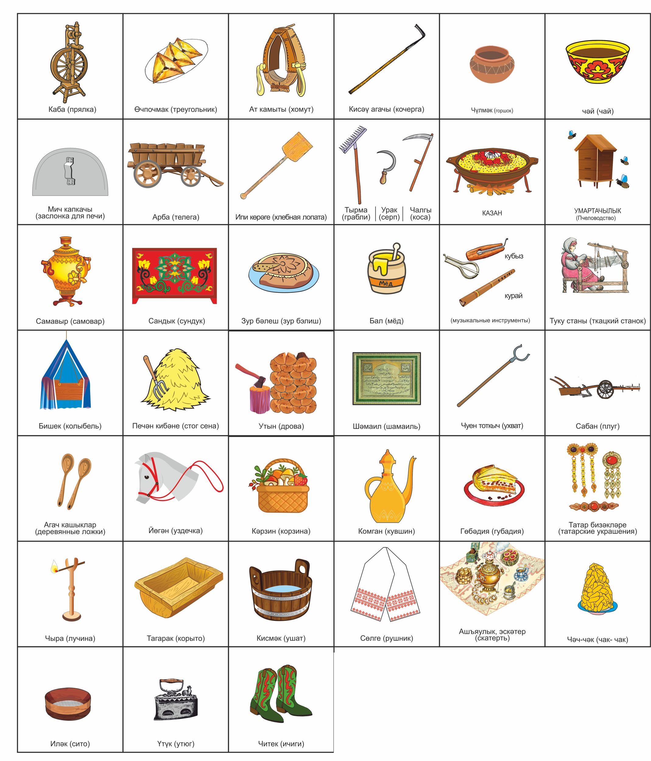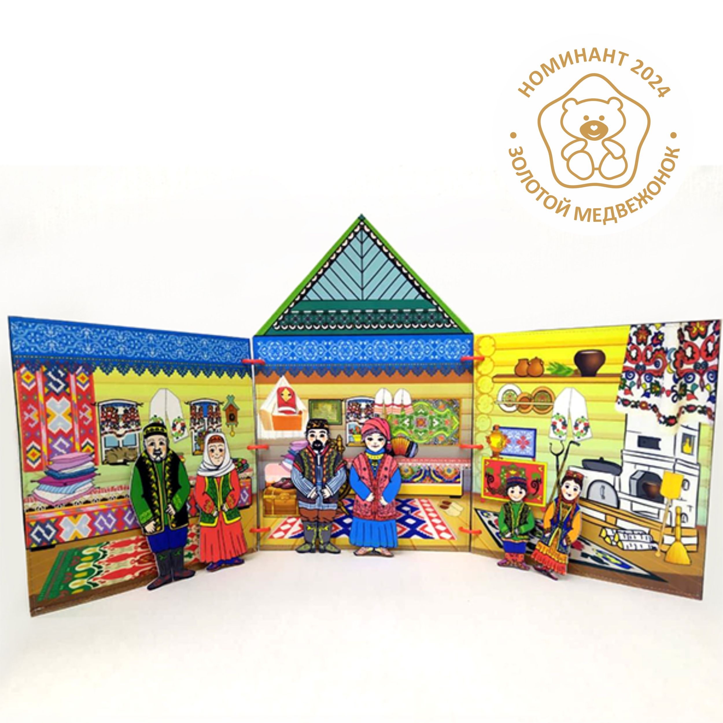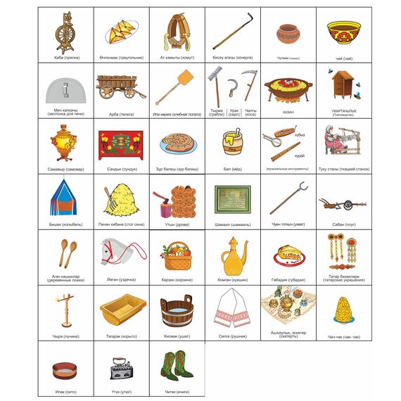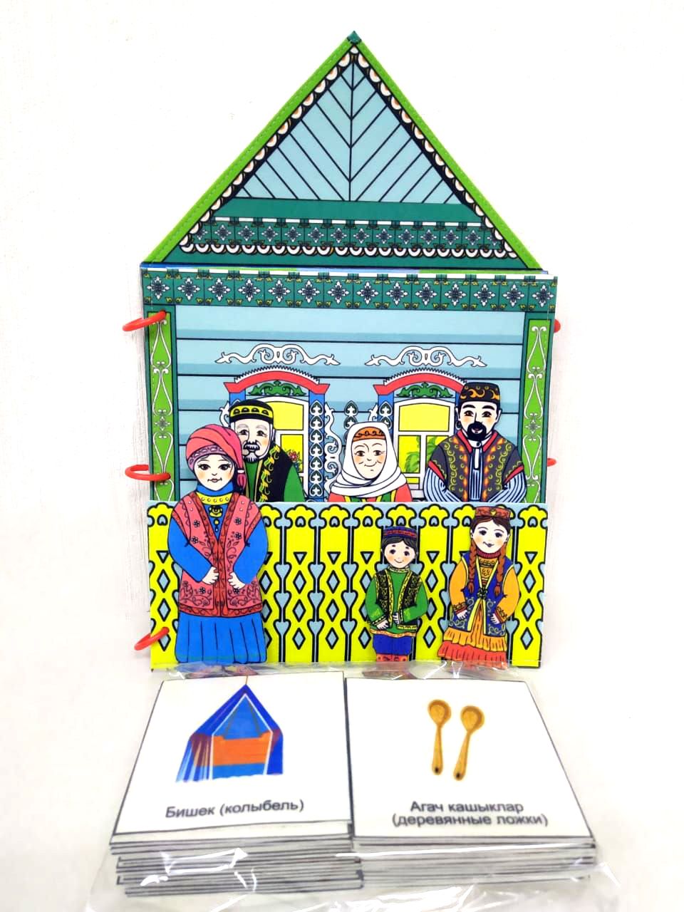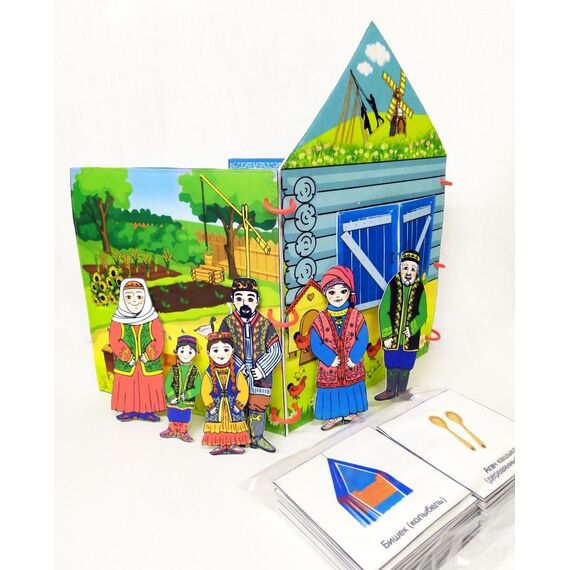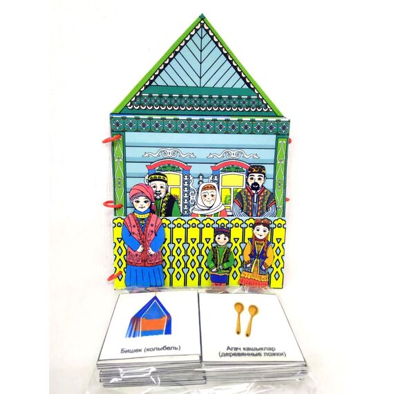 Папка «Татарская изба» изображает внутреннее убранство избы: предметы мебели, посуду, национальную одежду. Данная игрушка поможет узнать историю, особенности, культуру и быт. Вместе с папкой вы получите 6 фигурок людей (семья в национальных костюмах) и 39 карточек, изображающих предметы быта. Данный набор может использоваться как демонстрационный материал на занятиях по народной культуре.