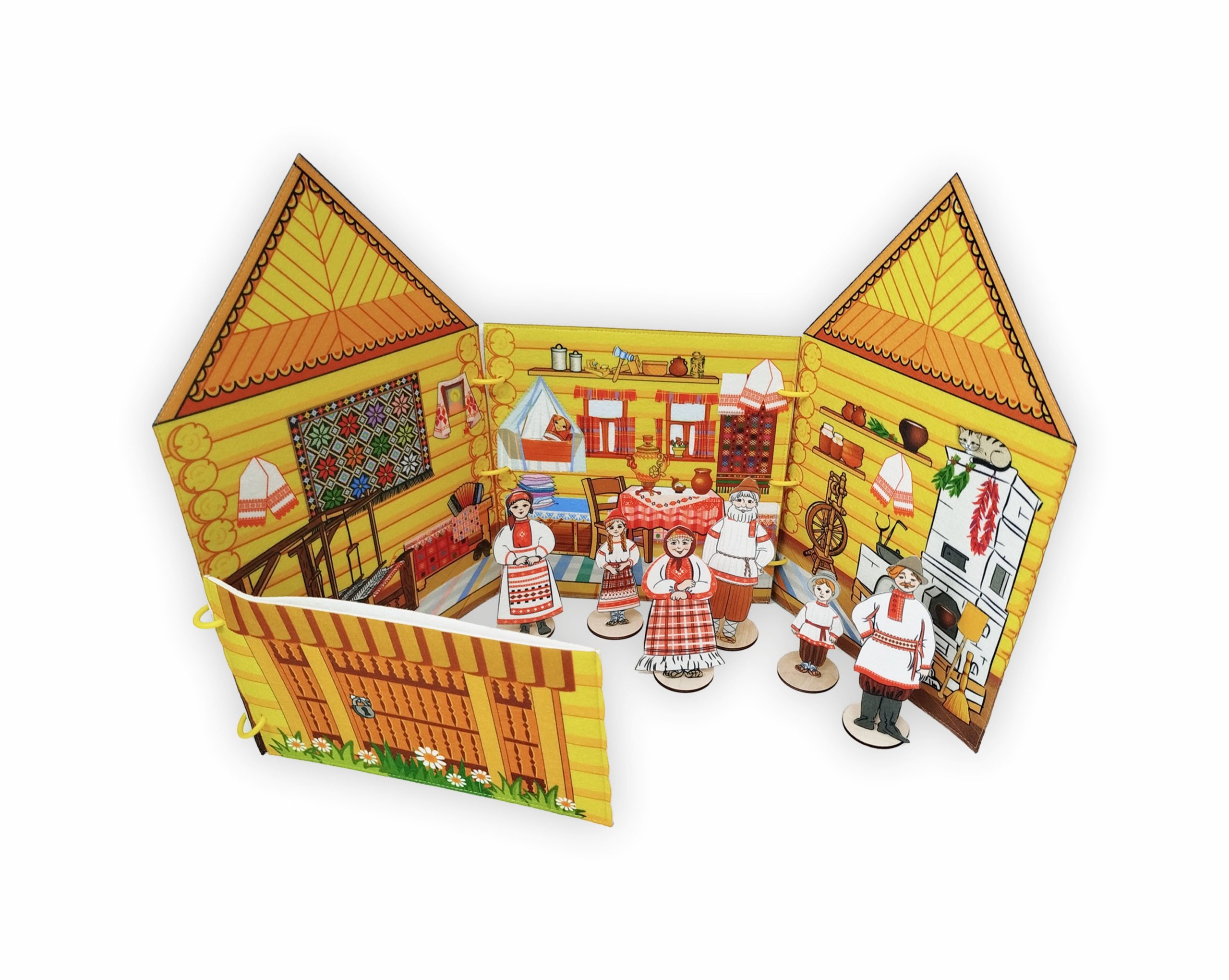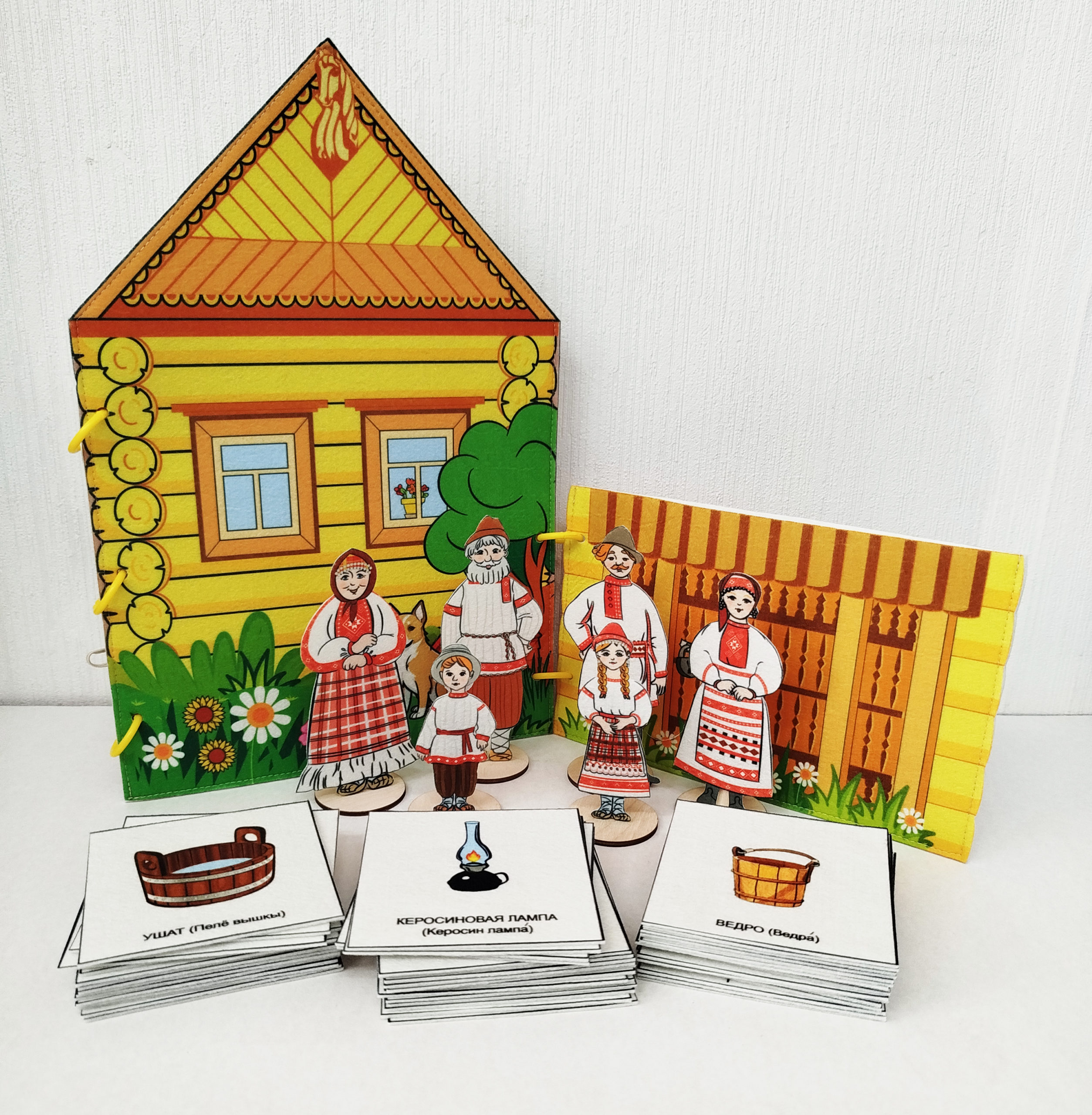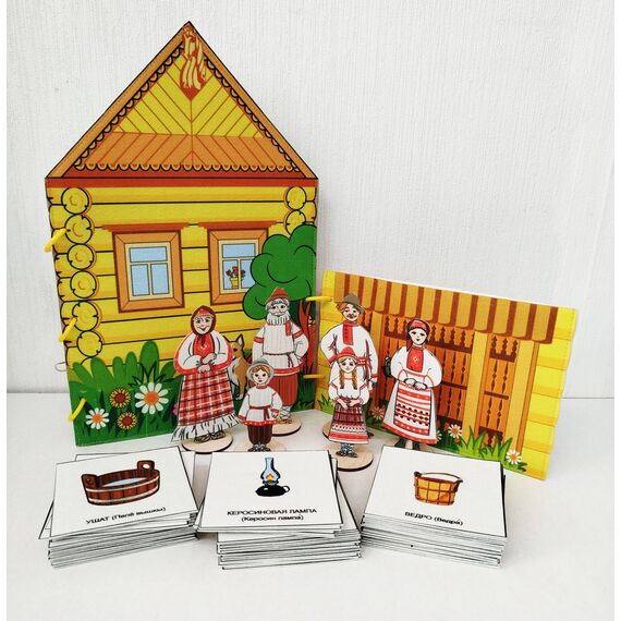 Папка «Удмуртская изба» изображает внутреннее убранство избы: предметы мебели, посуду, национальную одежду. Данная игрушка поможет узнать историю, особенности, культуру и быт. Вместе с папкой вы получите 6 фигурок людей (семья в национальных костюмах на деревянных подставках) и 45 карточек, изображающих предметы быта с их наименованием на 2х языках (русском и национальном). Данный набор может использоваться как демонстрационный материал на занятиях по народной культуре.