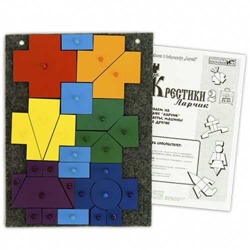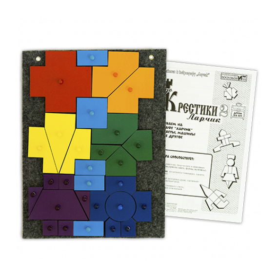 Состав: подложка (ковролин, крепление - липучка)– 1 шт.; детали игры – составные элементы крестика красного оранжевого, жёлтого, зелёного, голубого, синего цветов – 28 шт., каждая на липучке и с держателем «гвоздик», инструкция (А3, цв.), схемы конструирования.