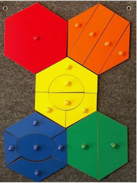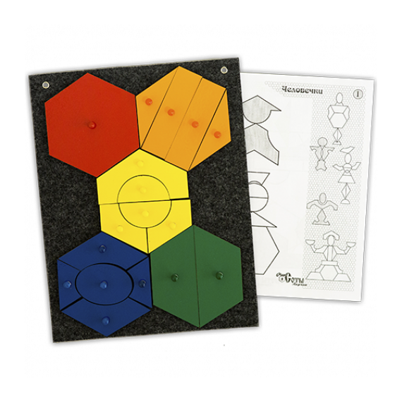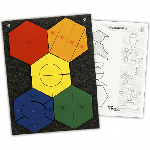 Состав: 5 фигур в форме соты (фанера, цветная пленка): 1 целая и 4 составные (из двух, четырех и пяти частей), снабжены держателями и липучкой для закрепления на Коврографе; подложка (280х380 мм, ковролин); альбом фигурок.