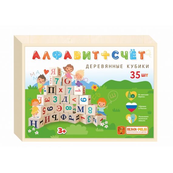 Кубики Алфавит + счет, 35 шт. в деревянной коробке