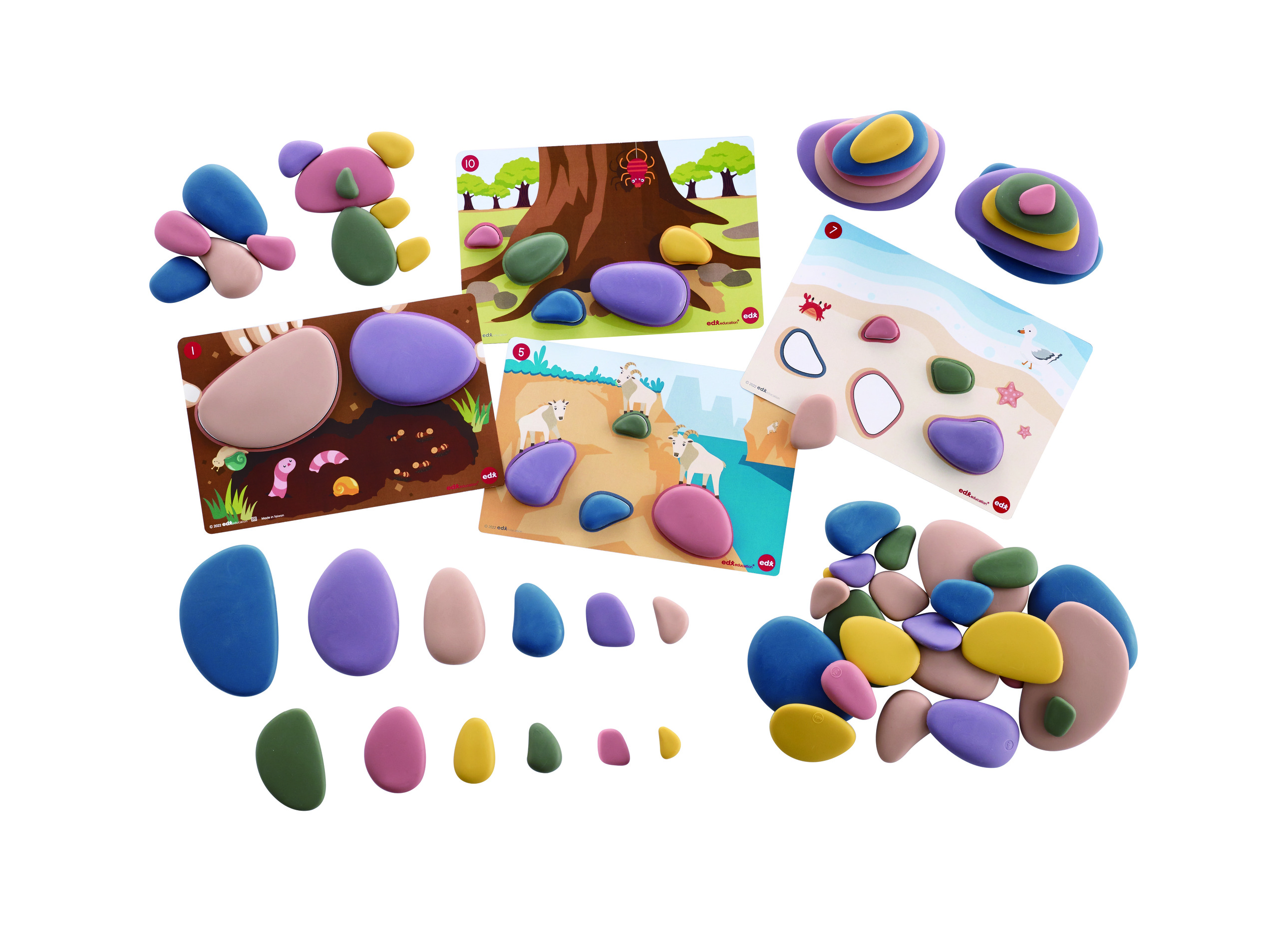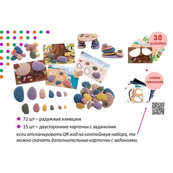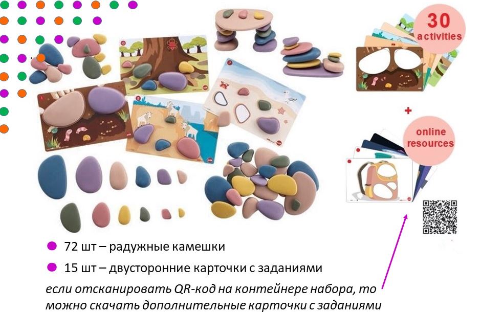 Набор "Радужные камешки" способствует сенсорному, социально-коммуникативному, познавательному, речевому и физическому развитию, а также оказывают положительное влияние на психику ребенка. С помощью радужных камешков дети могут учиться считать и сортировать по определенному признаку, знакомиться с понятиями «цвет», «размер», «форма». Набор используется как для индивидуальных, так и для групповых занятий.