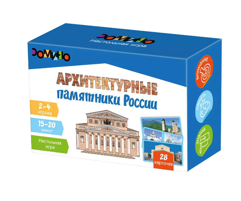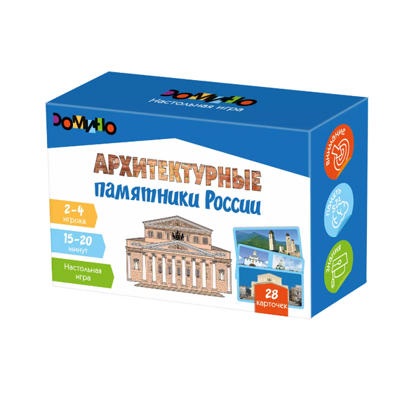 Настольная игра, которая понравится юным эстетам и любителям архитектуры и истории. Это увлекательное путешествие по самым знаменитым и необычным памятникам архитектуры России. Каждая постройка – это отражение конкретной культурной-исторической эпохи нашей страны… Игра включает в себя 28 карточек-фишек и ориентирована на 2-4 игроков. В основе – знакомый многим принцип домино, когда участники должны продолжить выкладку «дорожки» из фишек, подбирая подходящий по тематике фрагмент.