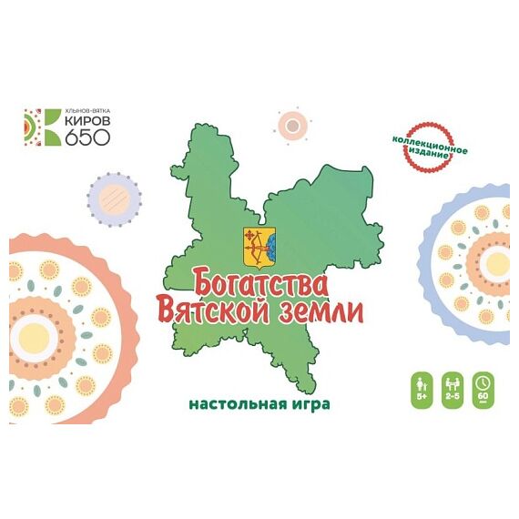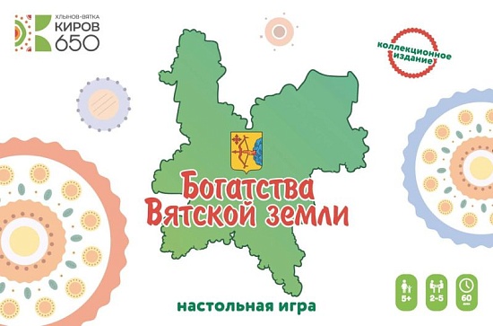 Эксклюзивная настольная игра "Богатства Вятской земли", выпущенная к 650-летию г. Кирова. Разрабатывалась совместно с психологами-методистами, краеведами и учениками кировских школ. «Богатства Вятской земли» − это не просто настольная игра, а целое путешествие по всем уголкам Кировской области.