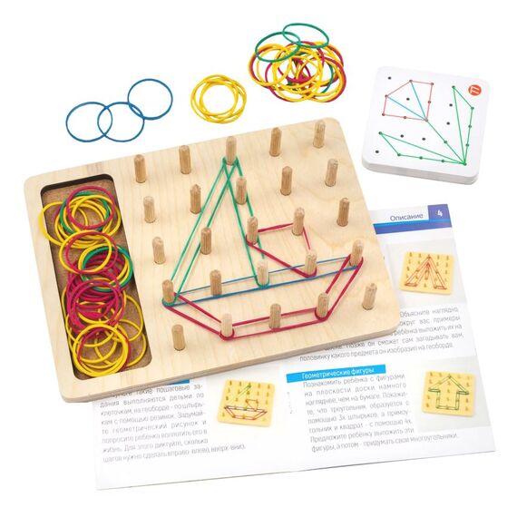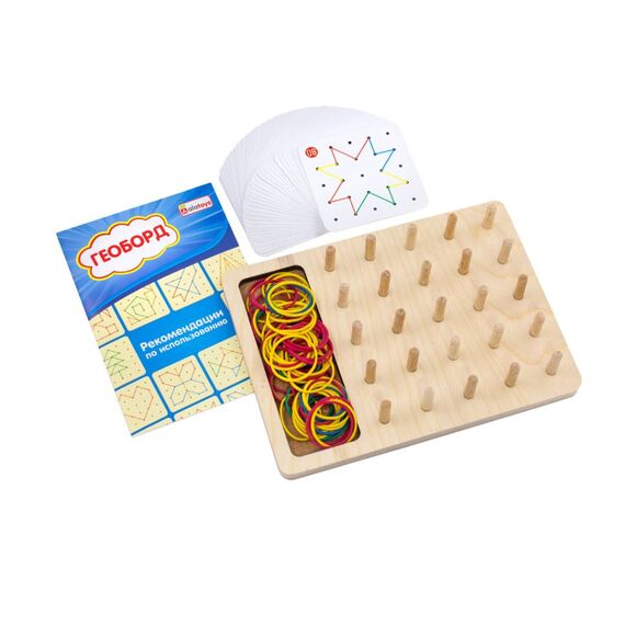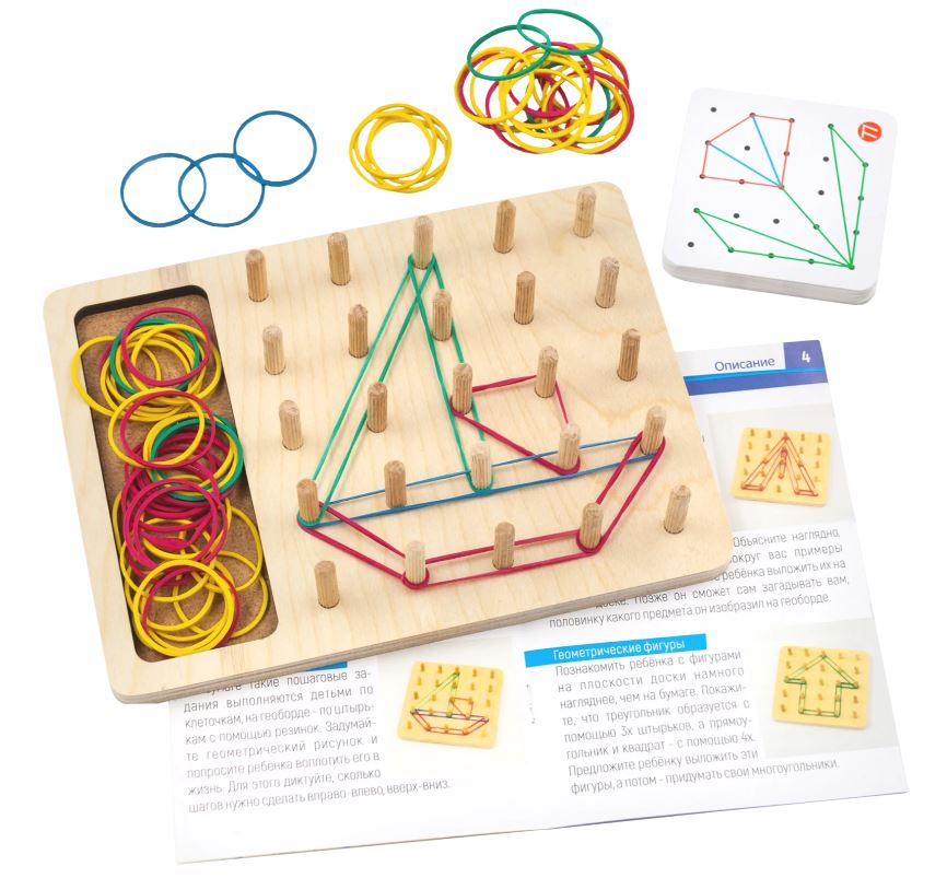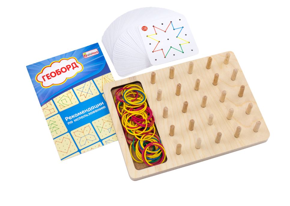 Геоборд с резинками или математический планшет от Алатойс — это деревянная развивающая игрушка в виде доски со штырьками, между которыми натягиваются резиночки. Игра создана для раннего развития детей по методике Монтессори. Использовать данную игрушку можно в развивающих играх и обучении деток с 3 лет, дошкольников и младших школьников. Геоборд математический со схемами увлечет вашего ребенка на долго.