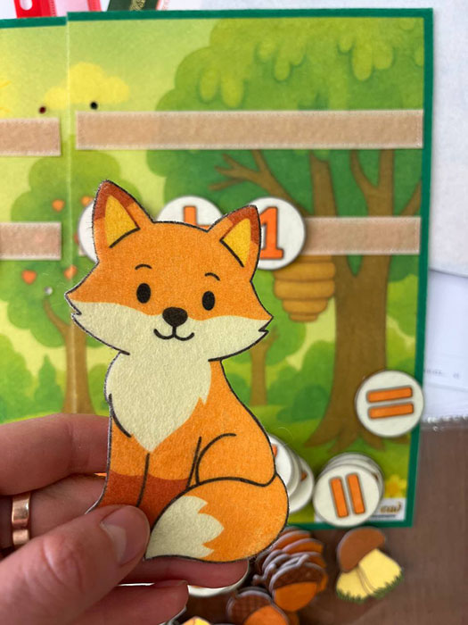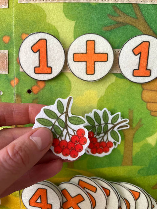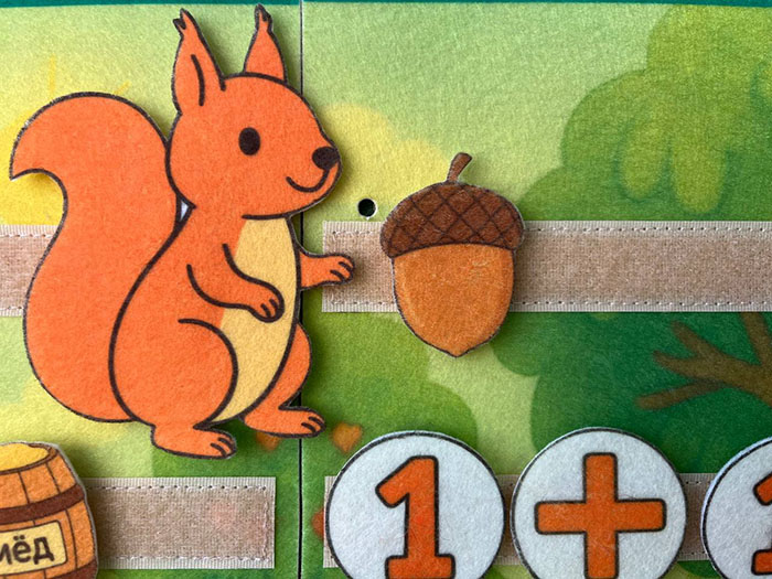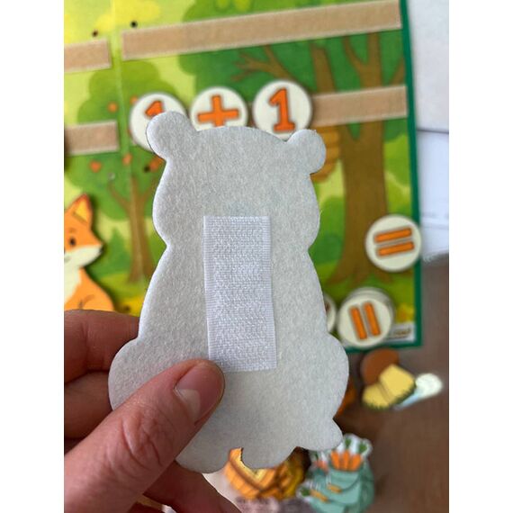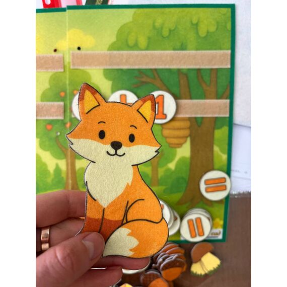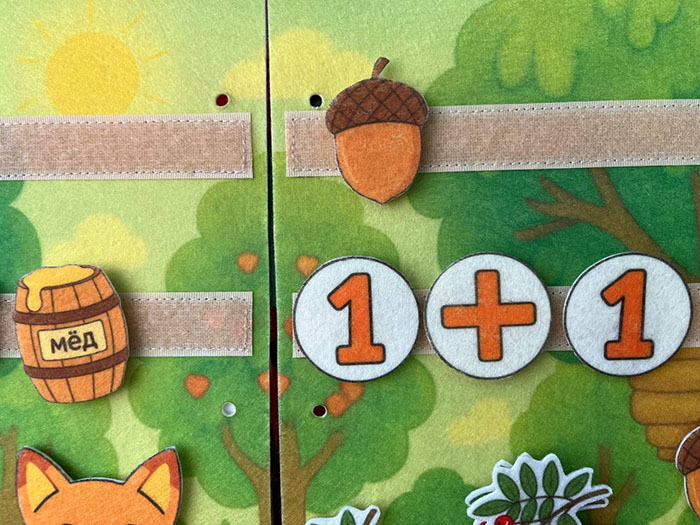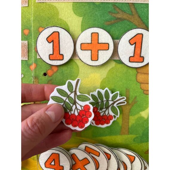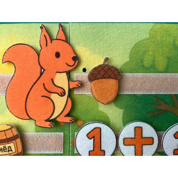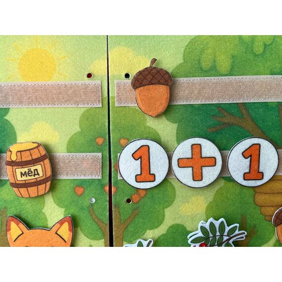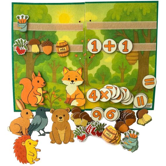 Панно "Лесная математика" из фетра представляет собой развивающую игрушку для детей, предназначенную для обучения основам математики в игровой форме. Оно состоит полотна, которое содержит различные элементы, связанные с природой и математикой.