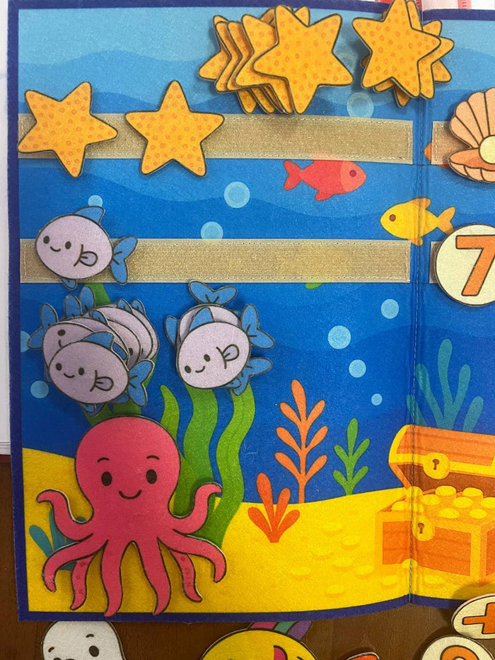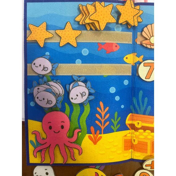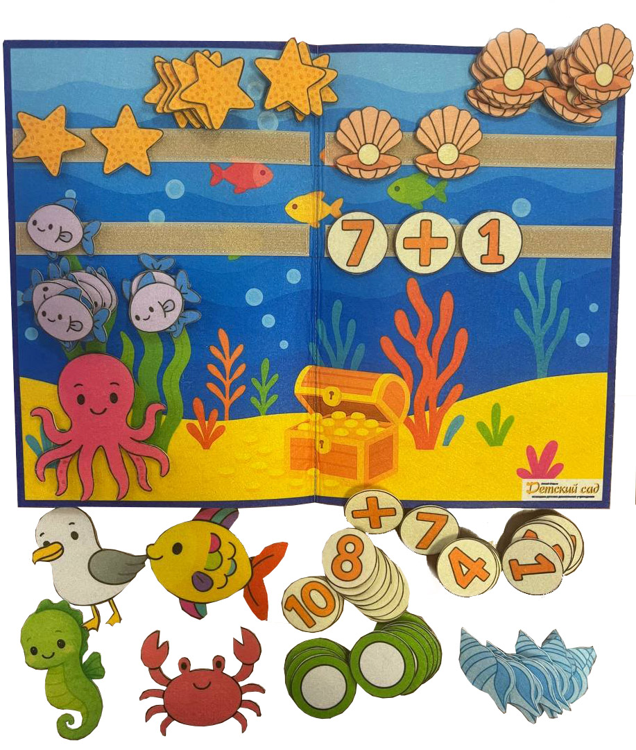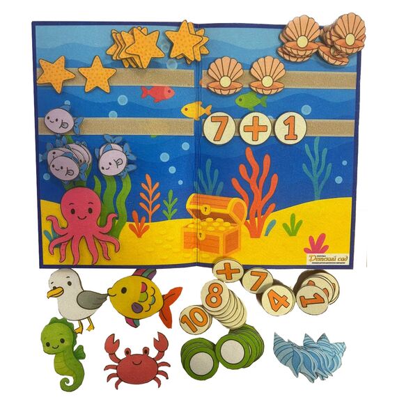 Панно МОРСКАЯ МАТЕМАТИКА (для детского сада) "АКСАЙТ" с изображением подводного мира, может стать частью обучающего материала для детей, посвященного морской тематике, так же является многофункциональным инструментом для развития у детей различных навыков и способностей через игру и взаимодействие с фетровыми элементами.
