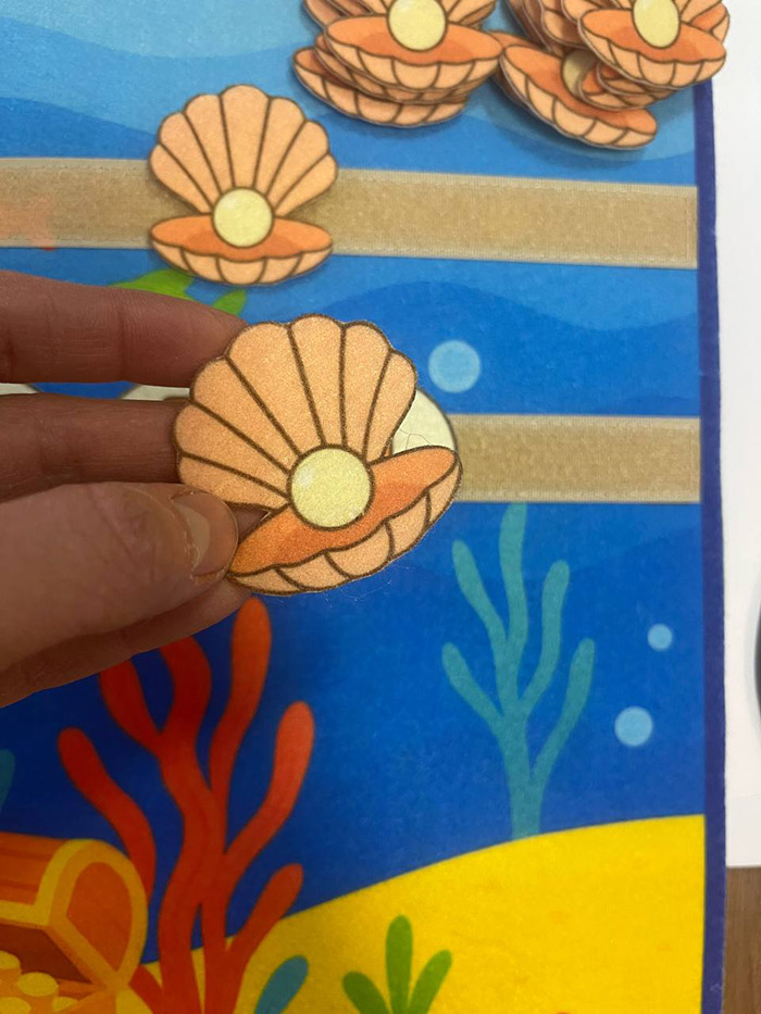 Панно МОРСКАЯ МАТЕМАТИКА (для детского сада) "АКСАЙТ" изготовлено в виде папки со сгибом. На панно прошиты ленты с липучками на двух страницах в два ряда. Ширина каждой ленты составляет 2 см, а длина — 18 см. Эти ленты предназначены для крепления фетровых элементов, что позволяет детям легко перемещать их по панно. Липучки обеспечивают надежное крепление элементов, что делает игру более удобной и безопасной.