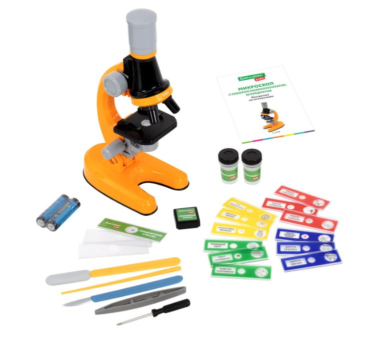 Микроскоп BRAUBERG KIDS - готовый набор юного учёного! Он прост в использовании и укомплектован всем необходимым для того, чтобы каждый ребёнок мог почувствовать себя настоящим исследователем. Оптика высокого качества обеспечивает увеличение (произведение кратности увеличения окуляра на кратность увеличения объектива) в 100х, 400х и даже 1200х.