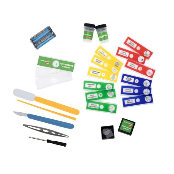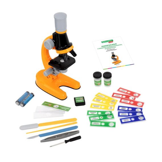 Встроенная LED-подсветка (батарейки в комплекте) создаст оптимальное освещение во время наблюдений. Микроскоп укомплектован 30 предметами для экспериментов, в том числе ПОДАРОЧНЫМ набором из 12 микропрепаратов.