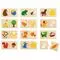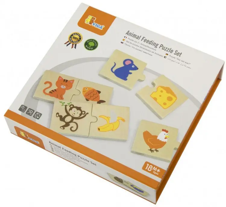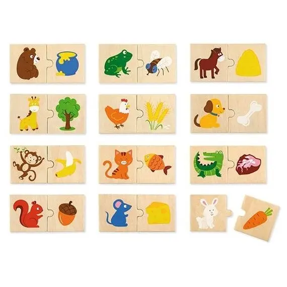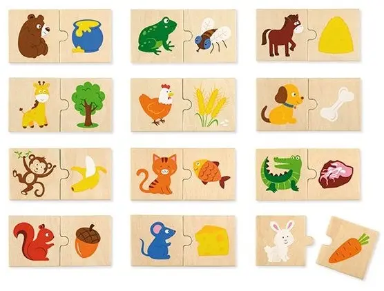 Набор состоит из 24 деревянных элемента с изображениями разных животных и пищи.