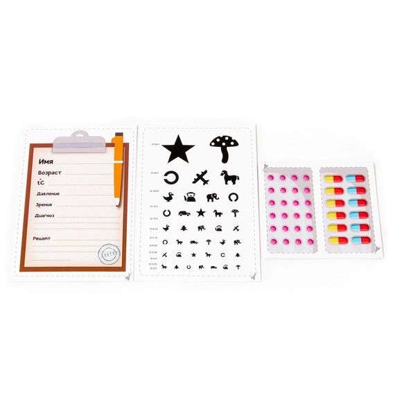Набор включает в себя: колпак медицинский; коробочка для таблеток; ложечка; лупа; ножницы; термометр; очки; лоток; фонендоскоп (для выслушивания шумов внутренних органов); отоскоп (инструмент лор-врача); тонометр (для измерения артериального давления); молоточек; шприц; мерный стаканчик с крышкой; баночка для лекарств; мини-чемоданчик.
