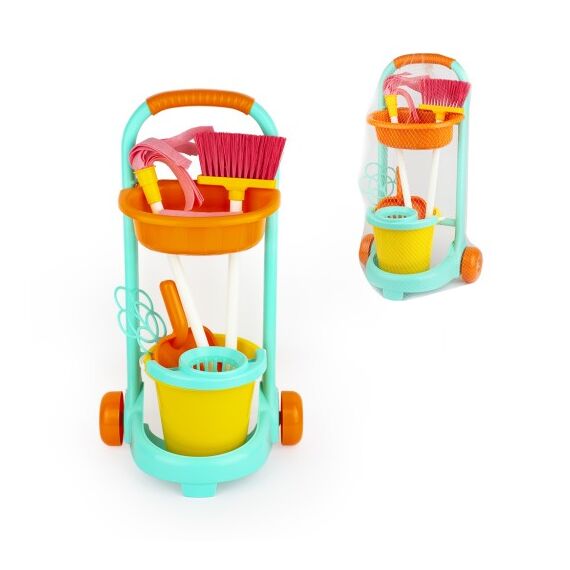 В него входят: щетка, совок, выбивалка, ведро, насадка на ведро, швабра, тележка, салфетка.