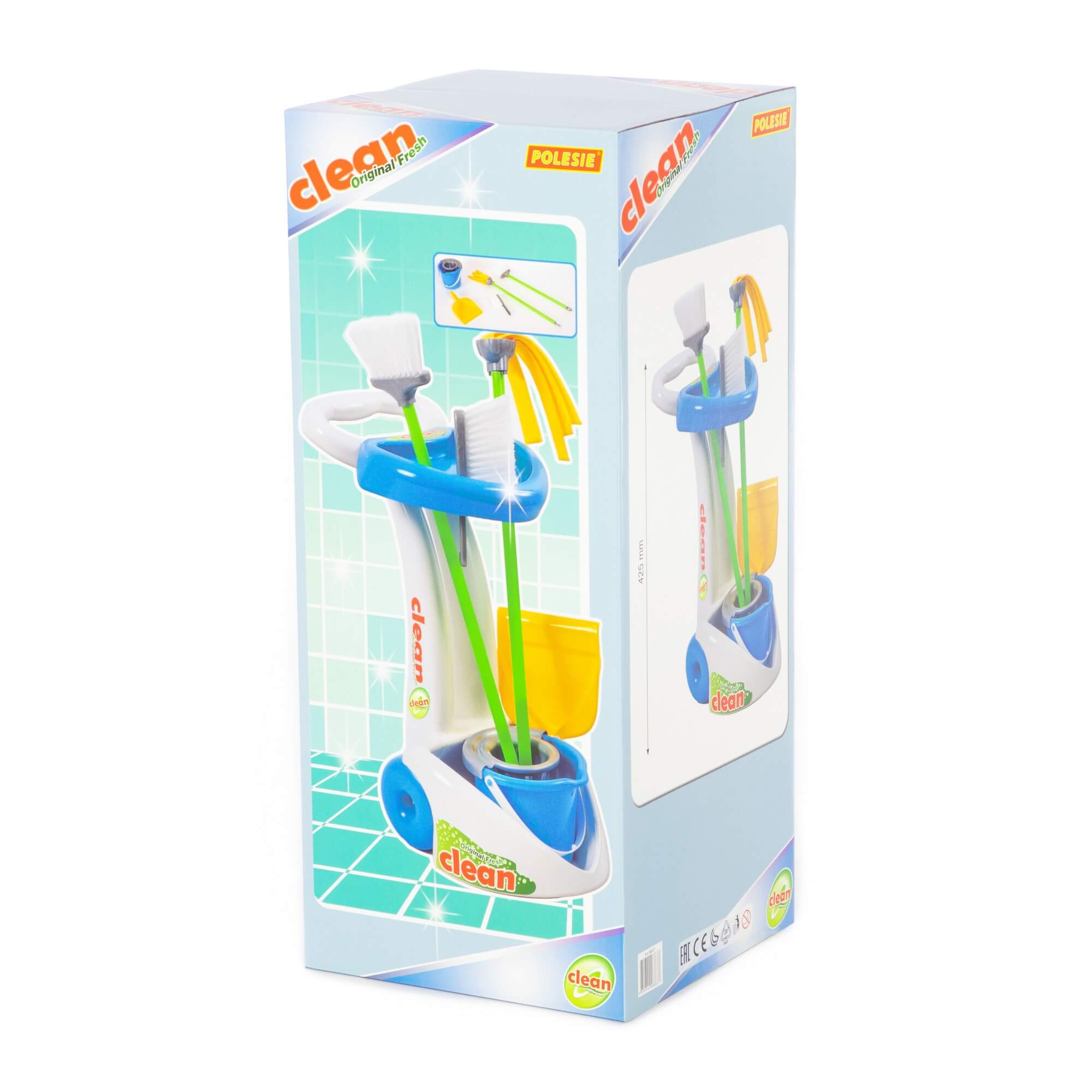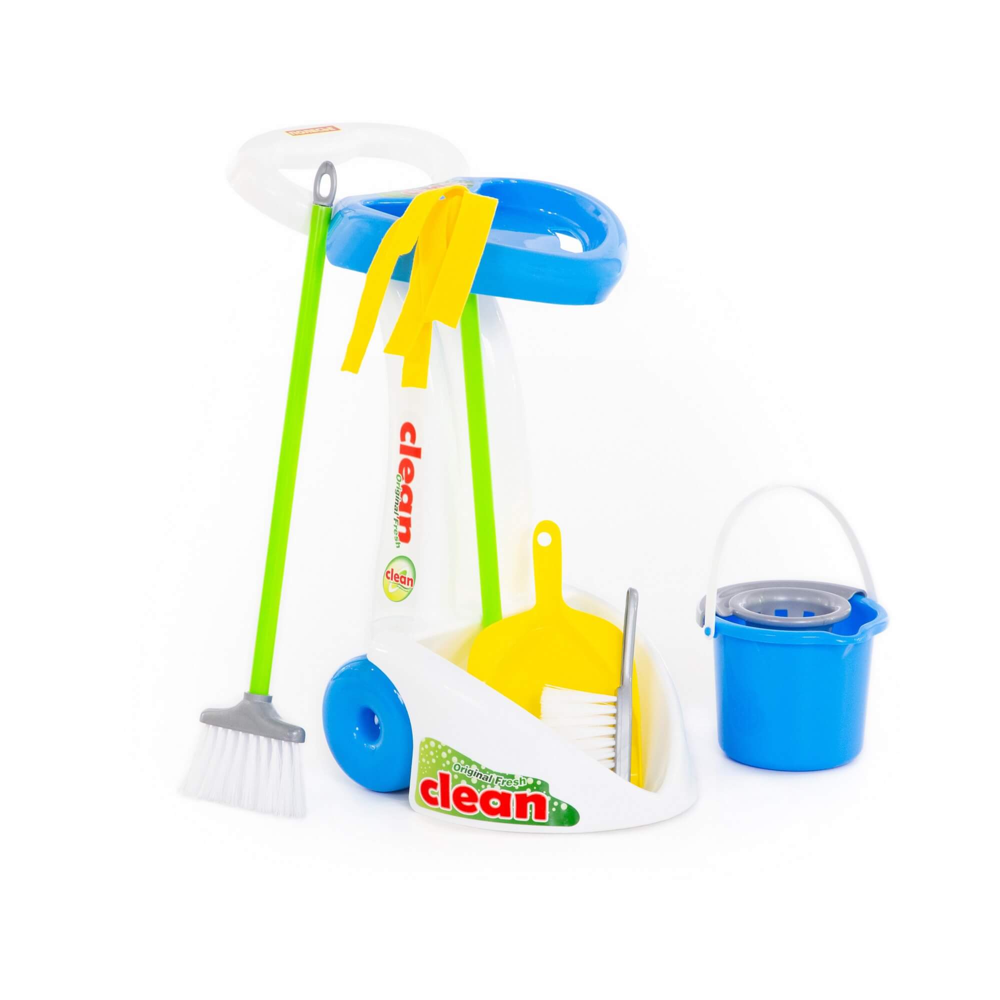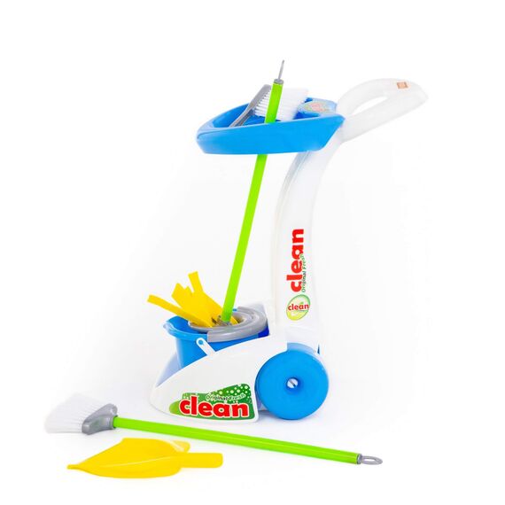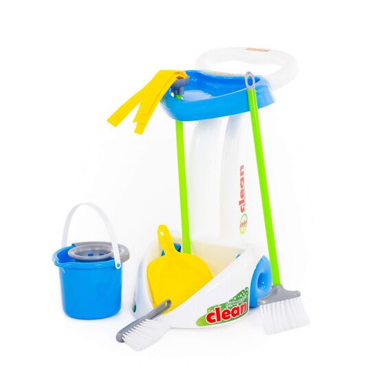 С набором «Чистюля» малыш играет и одновременно приучается к порядку. Игрушечный комплект полностью соответствует оригинальным приборам, которые используют современные хозяйки. Все принадлежности компактно расположены на передвижной тележке.