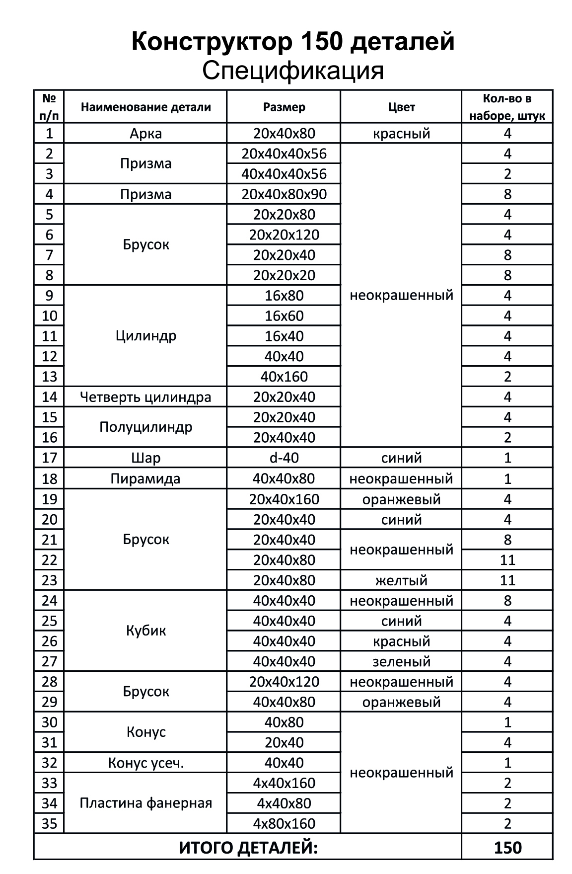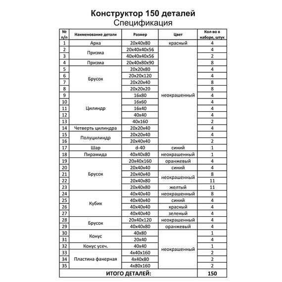 Спецификация № | Наименование | Размер | Цвет | Кол-во Арка — 20×40×80 — красный — 4 Призма — 20×40×40×56 — неокрашенный — 4 Призма — 40×40×40×56 — неокрашенный — 2 Призма — 20×40×80×90 — неокрашенный — 8 Брусок: 5. 20×20×80 — неокрашенный — 4 6. 20×20×120 — неокрашенный — 4 7. 20×20×40 — неокрашенный — 8 8. 20×20×20 — неокрашенный — 8 Цилиндр: 9. 16×80 — неокрашенный — 4 10. 16×60 — неокрашенный — 4 11. 16×40 — неокрашенный — 4 12. 40×40 — неокрашенный — 4 13. 40×160 — неокрашенный — 2 Четверть цилиндра — 20×20×40 — неокрашенный — 4 Полуцилиндр: 15. 20×20×40 — неокрашенный — 4 16. 20×40×40 — неокрашенный — 2 Шар — d-40 — синий — 1 Пирамида — 40×40×80 — неокрашенный — 1 20×40×160 — оранжевый — 4 20×40×40 — синий — 4 Брусок: 21. 20×40×40 — неокрашенный — 8 22. 20×40×80 — неокрашенный — 11 23. 20×40×80 — желтый — 11 Кубик: 24. 40×40×40 — неокрашенный — 8 25. 40×40×40 — синий — 4 26. 40×40×40 — красный — 4 27. 40×40×40 — зеленый — 4 Брусок: 28. 20×40×120 — неокрашенный — 4 29. 40×40×80 — оранжевый — 4 Конус: 30. 40×80 — неокрашенный — 1 31. 20×40 — неокрашенный — 4 Конус усечённый — 40×40 — неокрашенный — 1 Пластина фанерная: 33. 4×40×160 — неокрашенный — 2 34. 4×40×80 — неокрашенный — 2 35. 4×80×160 — неокрашенный — 2.