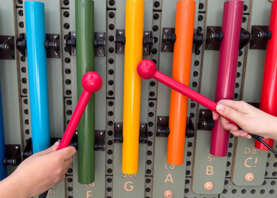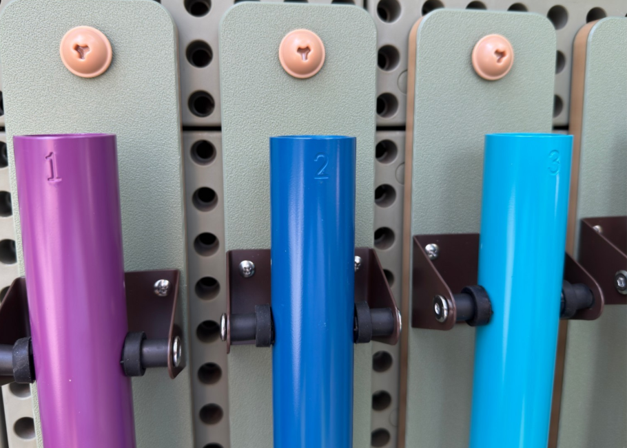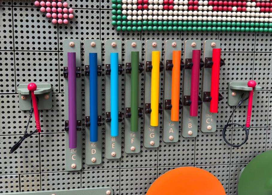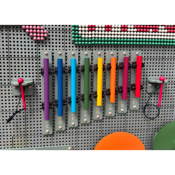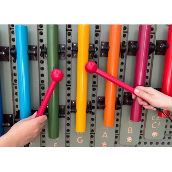 Колокольчики можно держать в руках или крепить внутри помещений и на улице на любой STEM‑стене или столе Masterkidz. Сами трубки изготовлены из специального алюминиевого сплава и окрашены в яркие цвета. Они закреплены на атмосферостойких пластиковых панелях.