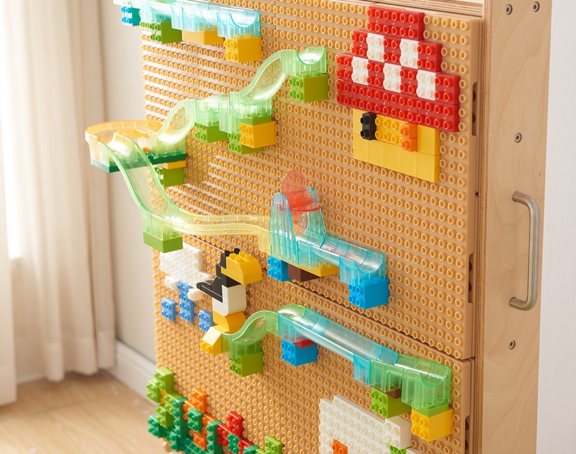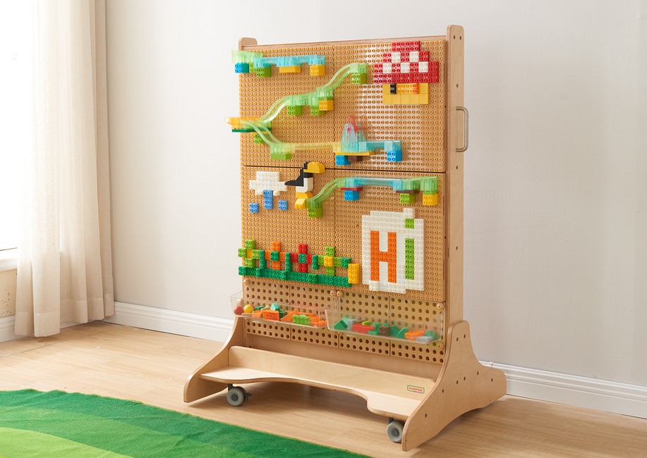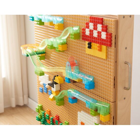Игровой набор представлен в виде конструктора, состоящего из 359 разноцветных деталей (строительные блоки разных размеров, желоба разной формы и шарики.) Является дополнением к STEM-стене и к STEM-столам.
