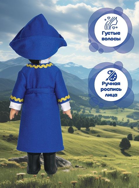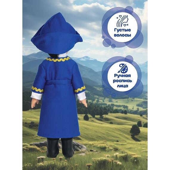 В комплект одежды входит: головной убор, белая рубашка, кафтан, брюки и кожаные сапожки. Рост куклы составляет 30 см. Чёрные густые волосы прошиты по всей голове. Глаза вставные, закрывающиеся. Роспись лица выполнена вручную, присутствуют элементы нанесения аэрографом. Ручки и голова выполнена из ПВХ-пластизоля, а туловище и ножки из пластмассы.