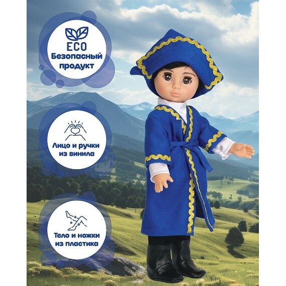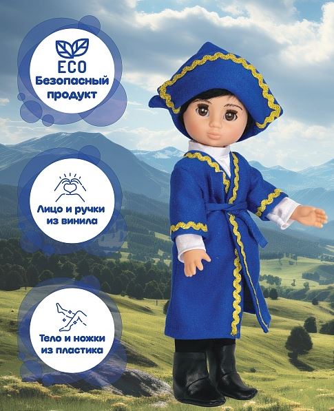 Кукла удобна в использовании, ручки и ножки можно поворачивать с легкостью. Продуманная конструкция куклы позволяет её сажать, ставить на ножки и переодевать. Алан в казахском костюме подходит для разнообразных сюжетных игр и познакомит ребёнка с национальными традициями Казахстана.