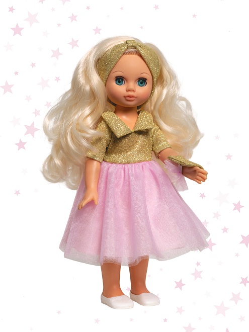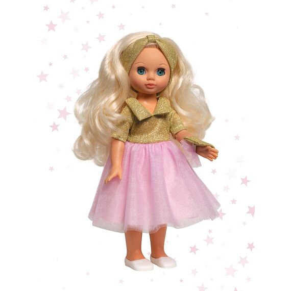 Кукла Эля Праздничная с длинными, блестящими волосами и в воздушном платье. Наряд включает в себя: платье с пышной розовой юбкой и золотистым верхом, белые туфельки, повязка на голову, сумка-клатч и трусики.