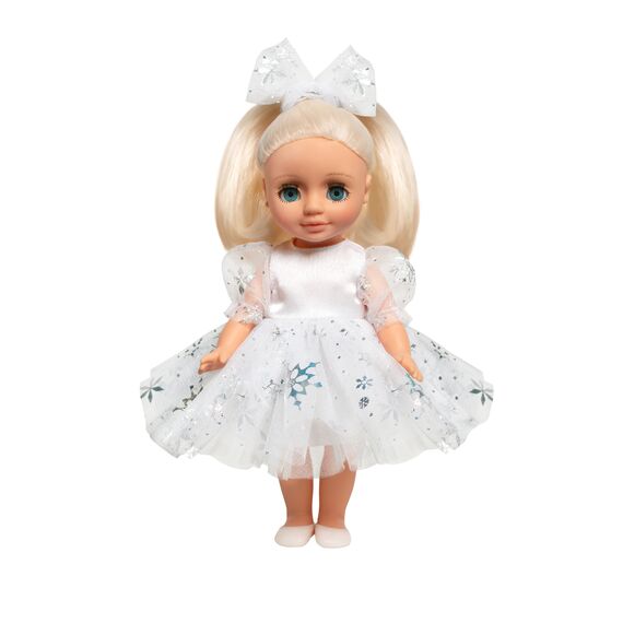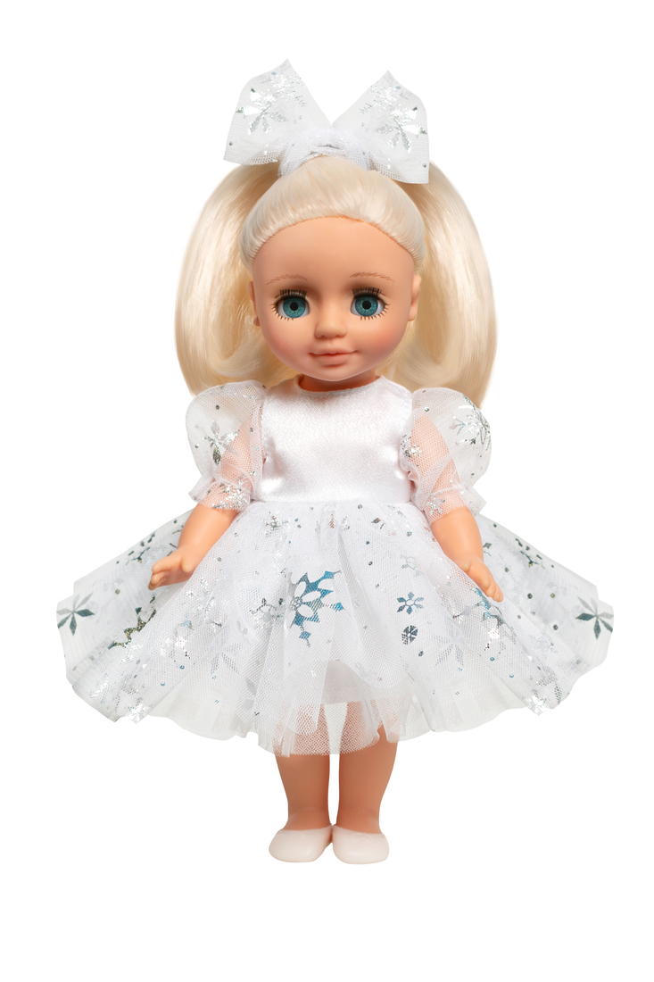 Образ включает в себя пышное платье со снежинками, трусики, повязка на голову, виниловые балетки. Элементы кукольной одежды, которые легко снимаются и надеваются, разнообразят возможности сюжетно-ролевых игр, способствует развитию мелкой моторики и творческого воображения ребёнка.