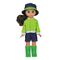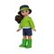 В комплект одежды входит: белая футболка, зелёная курточка-бомбер, джинсовые шорты, панамка, резиновые сапожки с принтом «лягушка» и трусики.