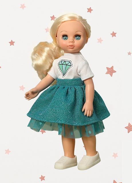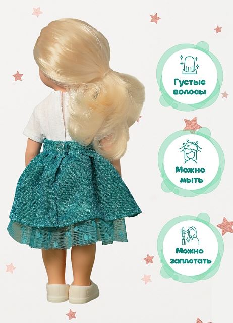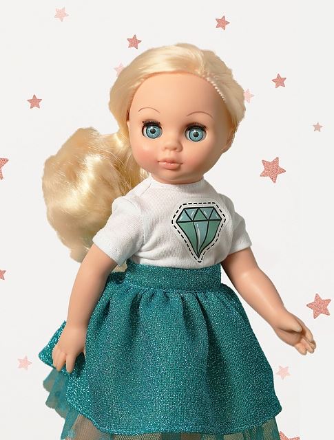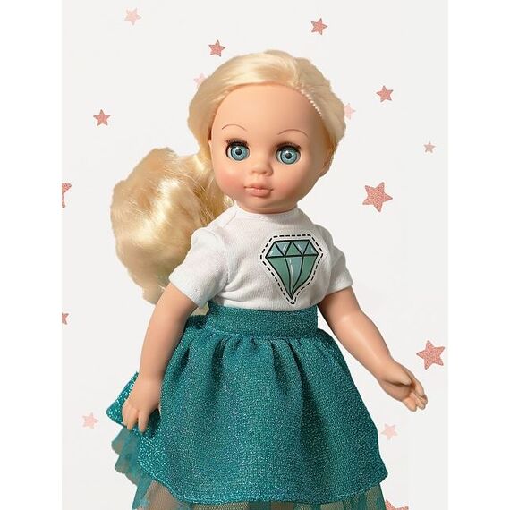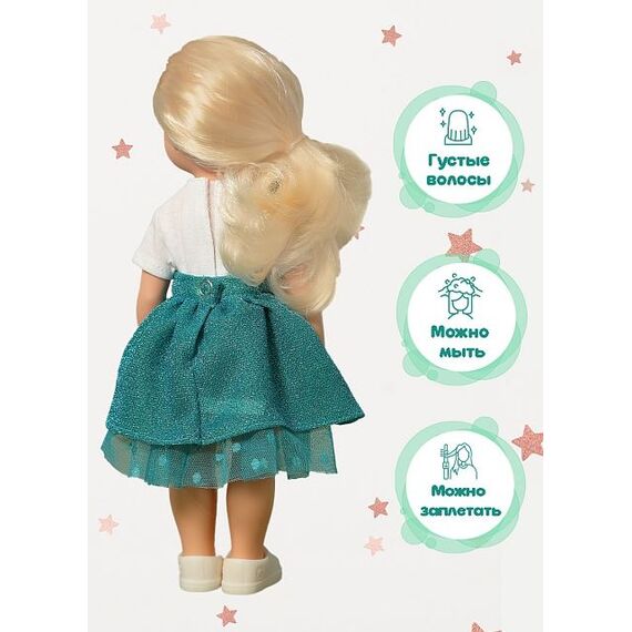 Рост куклы 30 см. Кукла Эля не озвучена. Глаза вставные закрывающиеся. Цвет глаз может варьироваться. Ручки и голова выполнены из эластичного, приятного на ощупь винила, а туловище и ноги из пластмассы.
