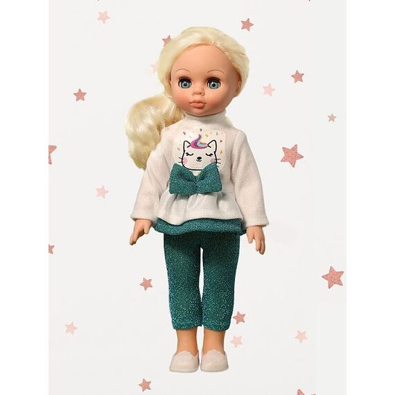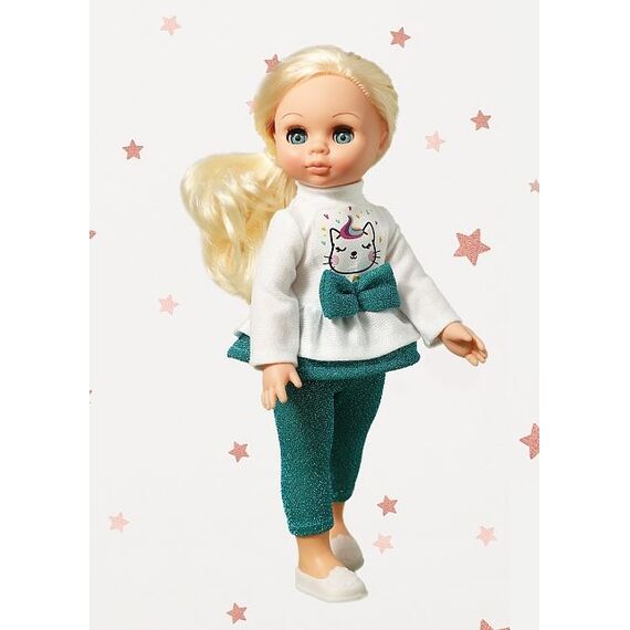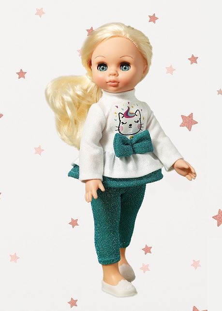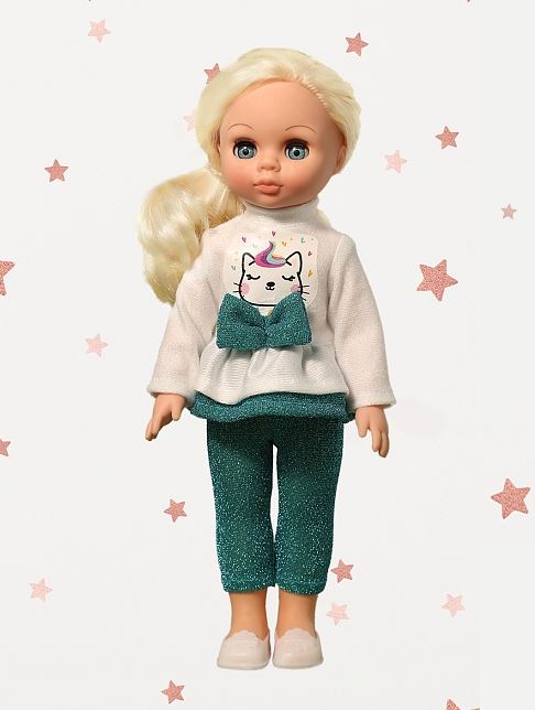 Рост куклы 30 см. Кукла Эля не озвучена. Глаза вставные закрывающиеся. Цвет глаз может варьироваться. Ручки и голова выполнены из эластичного, приятного на ощупь винила, а туловище и ноги из пластмассы.