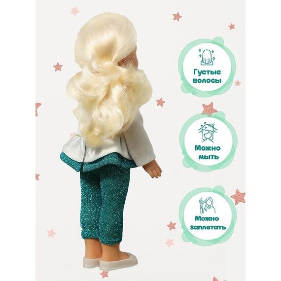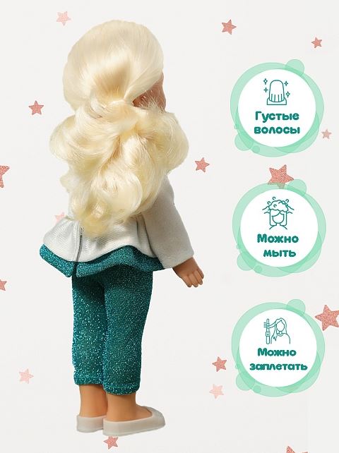 Игровые возможности куклы: элементы одежды, которые легко снимаются и надеваются, разнообразят возможности сюжетно-ролевых игр с этой куклой. В процессе игровой деятельности развивается мелкая моторика и творческое воображение ребёнка. Прекрасные прошитые волосы из качественного нейлона, похожие на натуральные, можно завивать, расчёсывать, укладывать в разные причёски, меняя образ куклы.