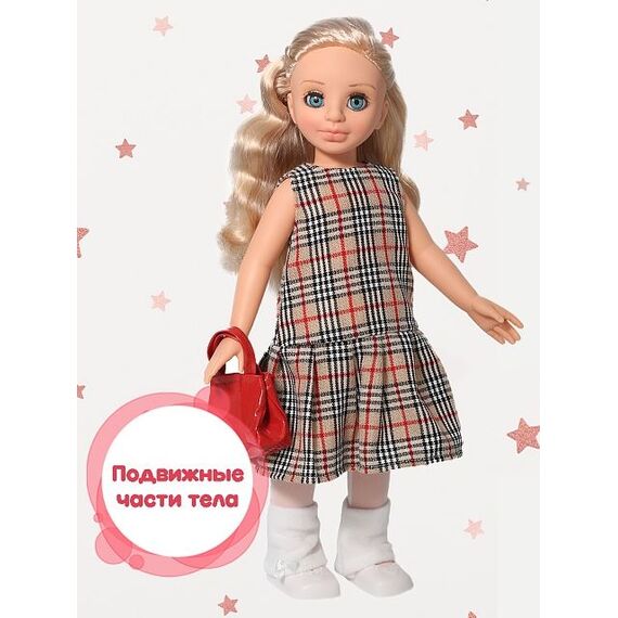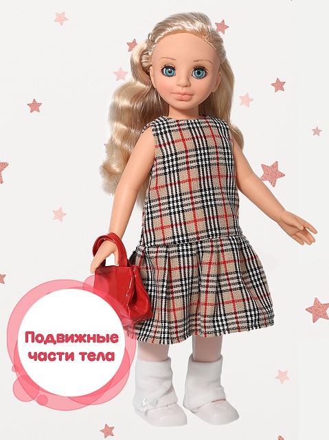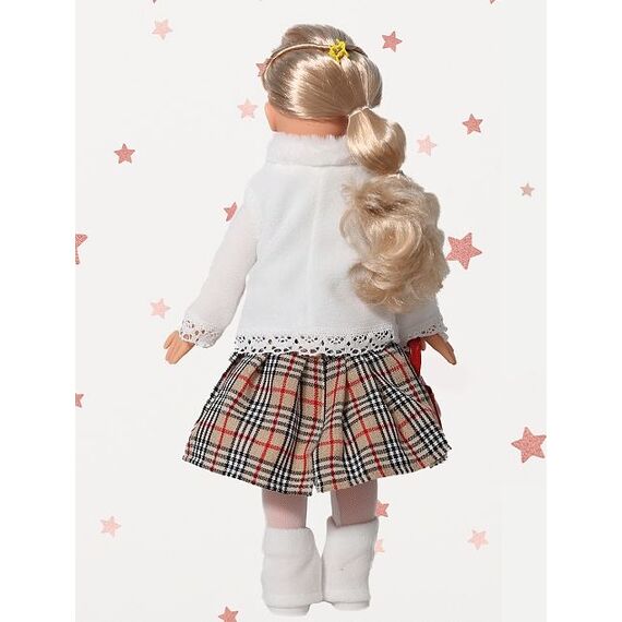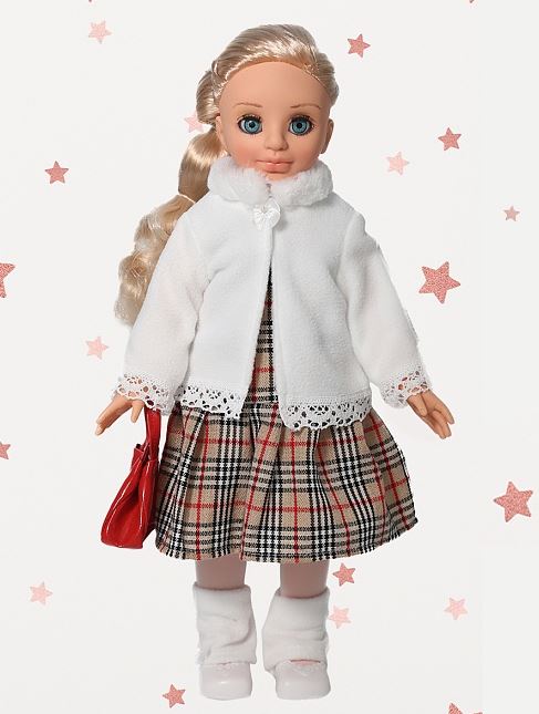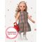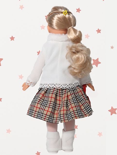 В комплект одежды входит: платье из костюмной клетки отрезное по линии бёдер, без рукавов и воротника, с застёжкой сзади на липкую ленту. Куртка из флиса с воротником-стойкой из искусственного меха, с длинными рукавами, застёжкой спереди сверху на липкую ленту. По низу куртки и низу рукавов настрочено вязаное кружево. Гетры из флиса с бантиками. Колготки из сетки-стрейч. Сумка из искусственной кожи с застёжкой на липучку крепится к руке куклы атласной лентой. Комплект дополнен туфлями.