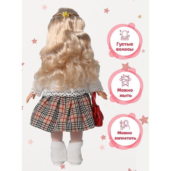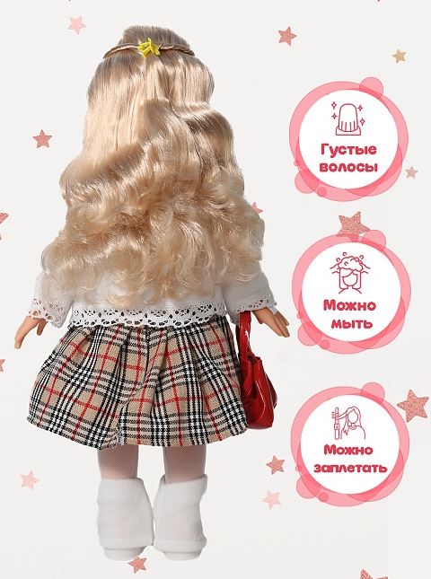 Игровые возможности куклы: прекрасные длинные волосы, похожие на натуральные, можно завивать, расчёсывать и укладывать в разные причёски, меняя образ куклы. Продуманная конструкция позволяет легко сажать куклу, ставить на ножки, переодевать. Кукла полностью выполнена из современного материала винила. Глаза вставные закрывающиеся. Цвет глаз может варьироваться. Высота 46 см. Кукла не озвучена.