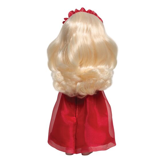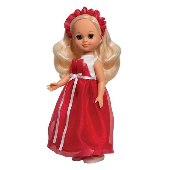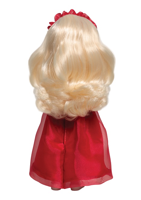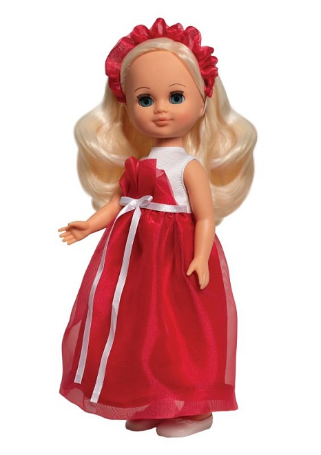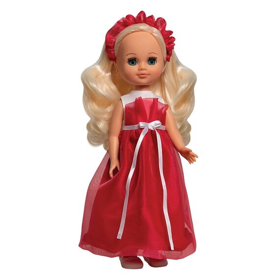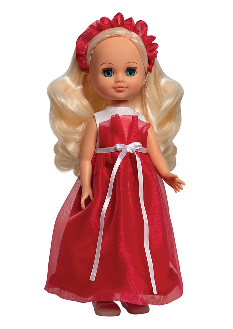 В комплект одежды входит: нарядное красное длинное платье с белым бантом, ажурная повязка на голову, туфельки и трусики. Элементы кукольной одежды, которые легко снимаются и надеваются, разнообразят возможности сюжетно-ролевых игр, в процессе которых развивается мелкая моторика и творческое воображение ребёнка. кукла озвучена.