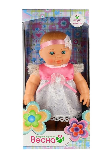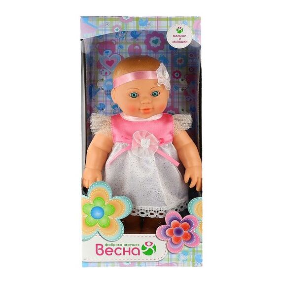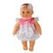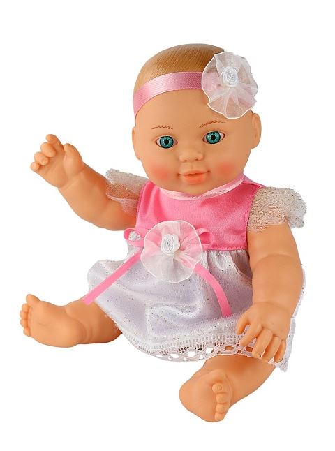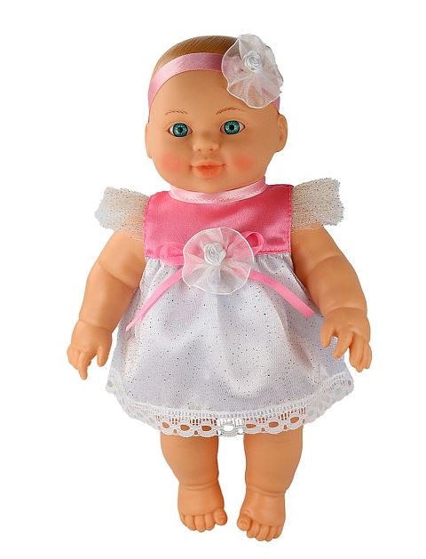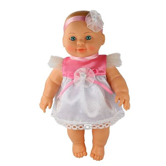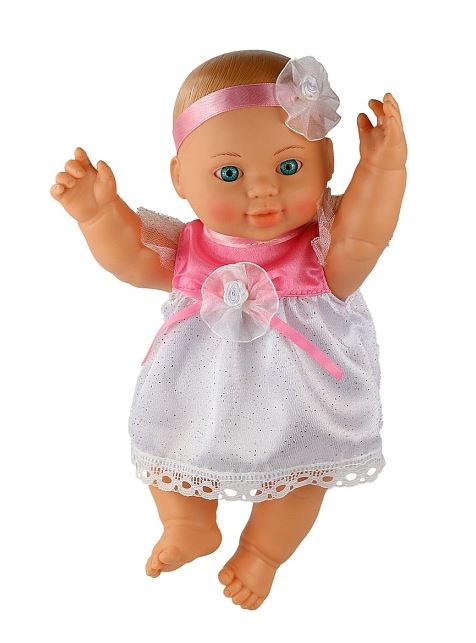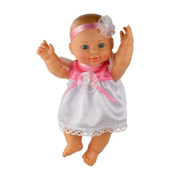 Высота 30 см. Тело куклы пропорционально и гармонично, полностью выполнено из эластичного, приятного на ощупь винила. Глазки малышки вставные, незакрывающиеся, имеет рельефный кукольный паричок, без звукового модуля. Пупс не имеет гендерных признаков.