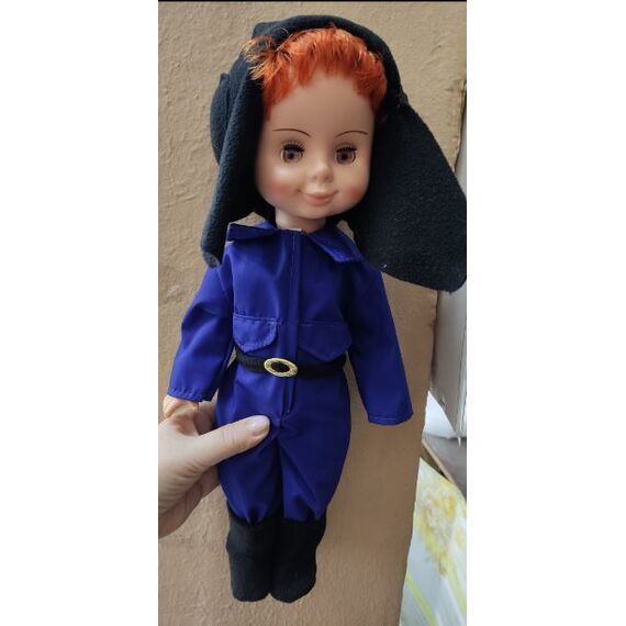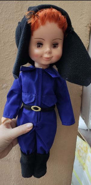 Голова , руки , ноги- пластизоль (резина) , туловище полиэтилен. Глаза закрываются . Волосы нить полипропиленовая. Костюм из ткани гретта и шапка (шлем) из флиса. Рост куклы 45 см