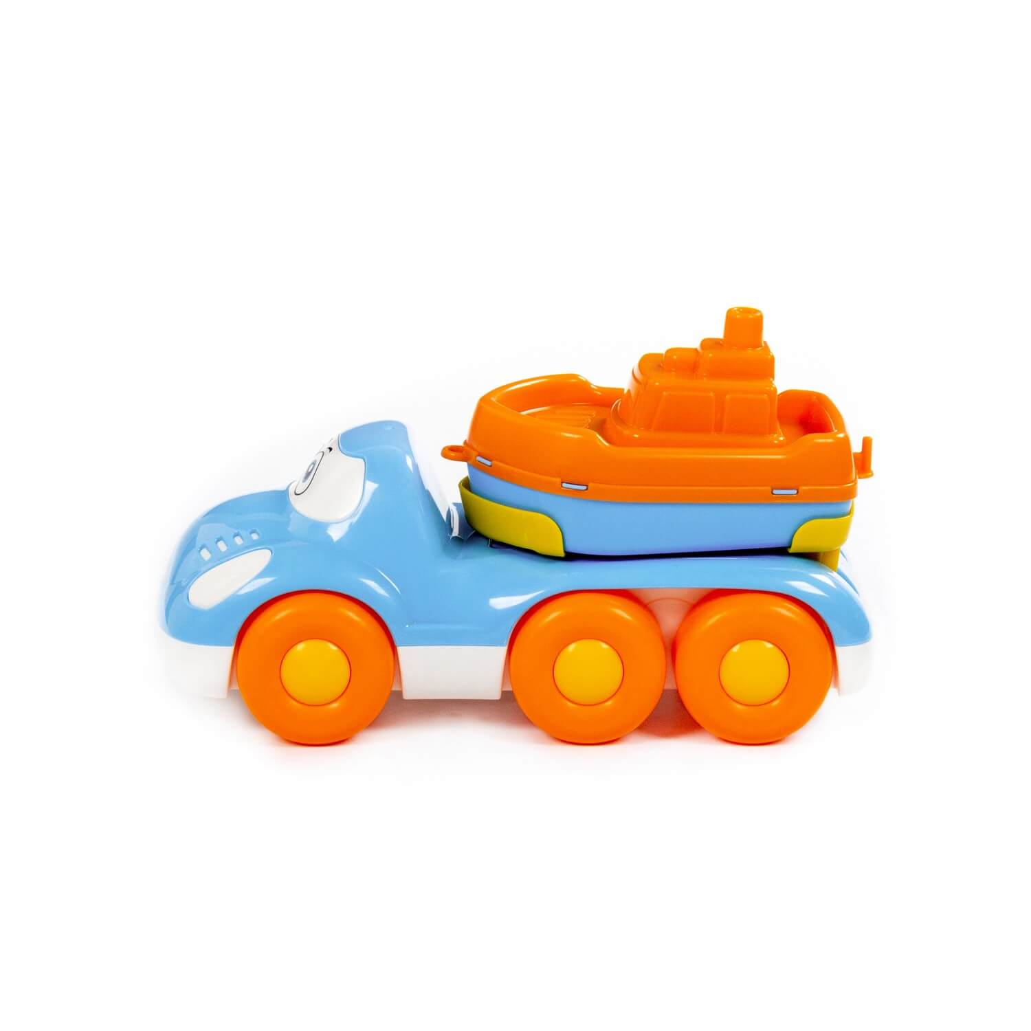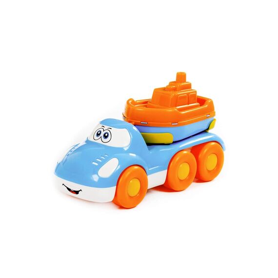 Конструкция автомобиля для перевозки предполагает наличие прицепной платформы, на которой располагается кораблик. Такие игрушки станут незаменимыми для игр в песочнице, а также ранообразят игру дома.