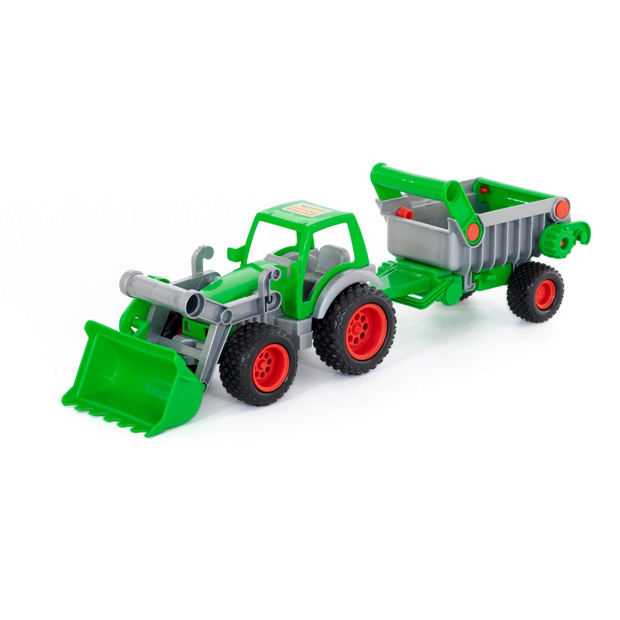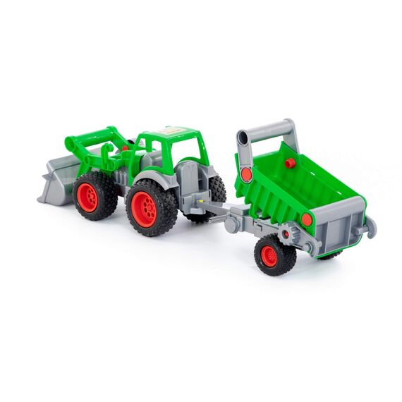 Трактор-погрузчик с полуприцепом из серии «Фермер-техник» - многофункциональная игрушка. Ковш трактора и борта прицепа подвижны, что добавляет реалистичности и удобства во время игры дома и на свежем воздухе. Полуприцеп можно отсоединить, что позволит использовать только кабину с ковшом. Колеса трактора имеют резиновые покрышки, которые повышают проходимость игрушки на любой поверхности.