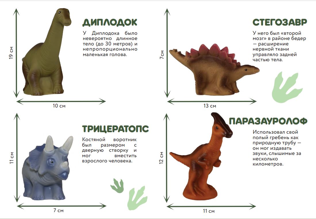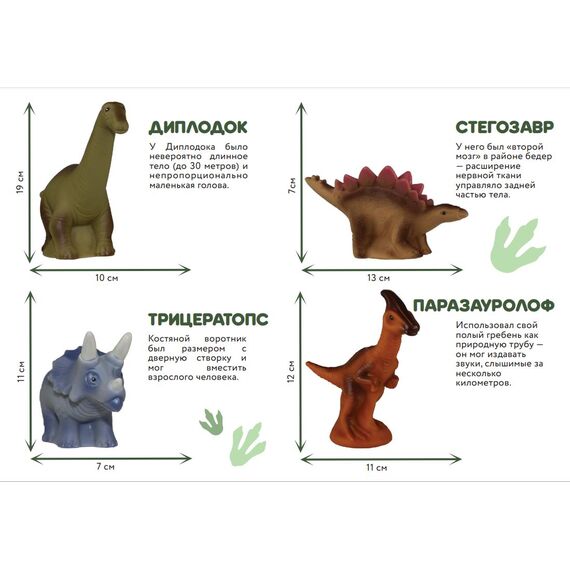 Комплектация: диплодок 19х10 см; стегозавр 7х13 см; трицератопс11х7 см; паразауролоф 12х11 см.