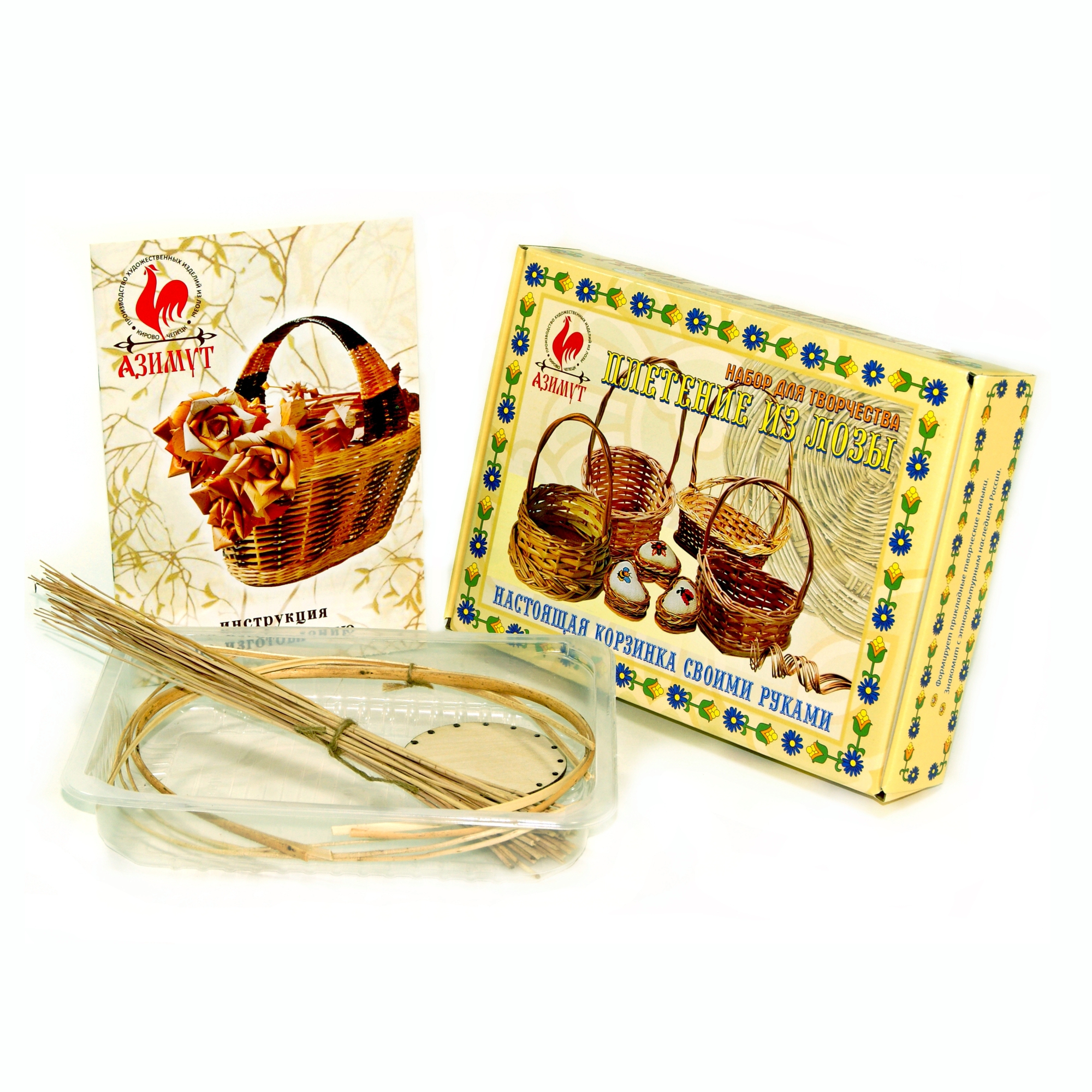 Комплетация: ивовая лоза, ивовая лента, фанерное донышко, контейнер для замачивания, инструкция.